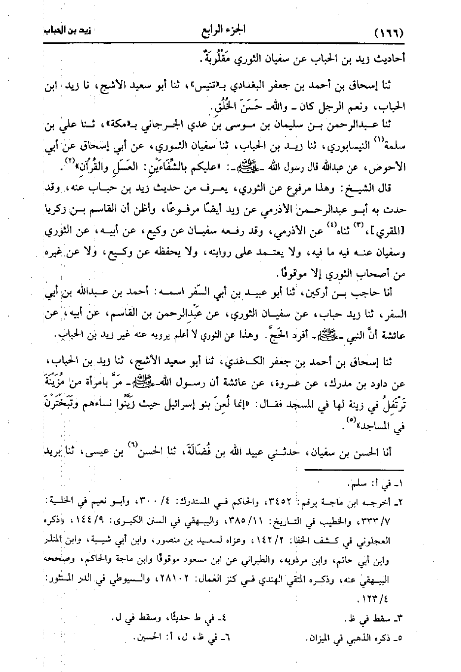 حَدَّثَنَا عَبد الرَّحْمَنِ بْنُ سُلَيْمَانَ بْنِ مُوسَى بْنِ عَدٍّي الْجُرْجَانِيُّ بمكة، حَدَّثَنا علي بن سلمة النيسابوري، حَدَّثَنا زيد بن الحباب، حَدَّثَنا سُفْيَانُ الثَّوْريّ، عَن أَبِي إِسْحَاقَ، عَن أَبِي الأَحْوصِ عَنْ عَبد اللَّهِ قَال رَسُول اللهِ صَلَّى اللَّهُ عَلَيهِ وَسلَّمَ عَلَيْكُمْ بِالشِّفَاءَيْنِ الْعَسَلُ وَالْقُرْآنُ.