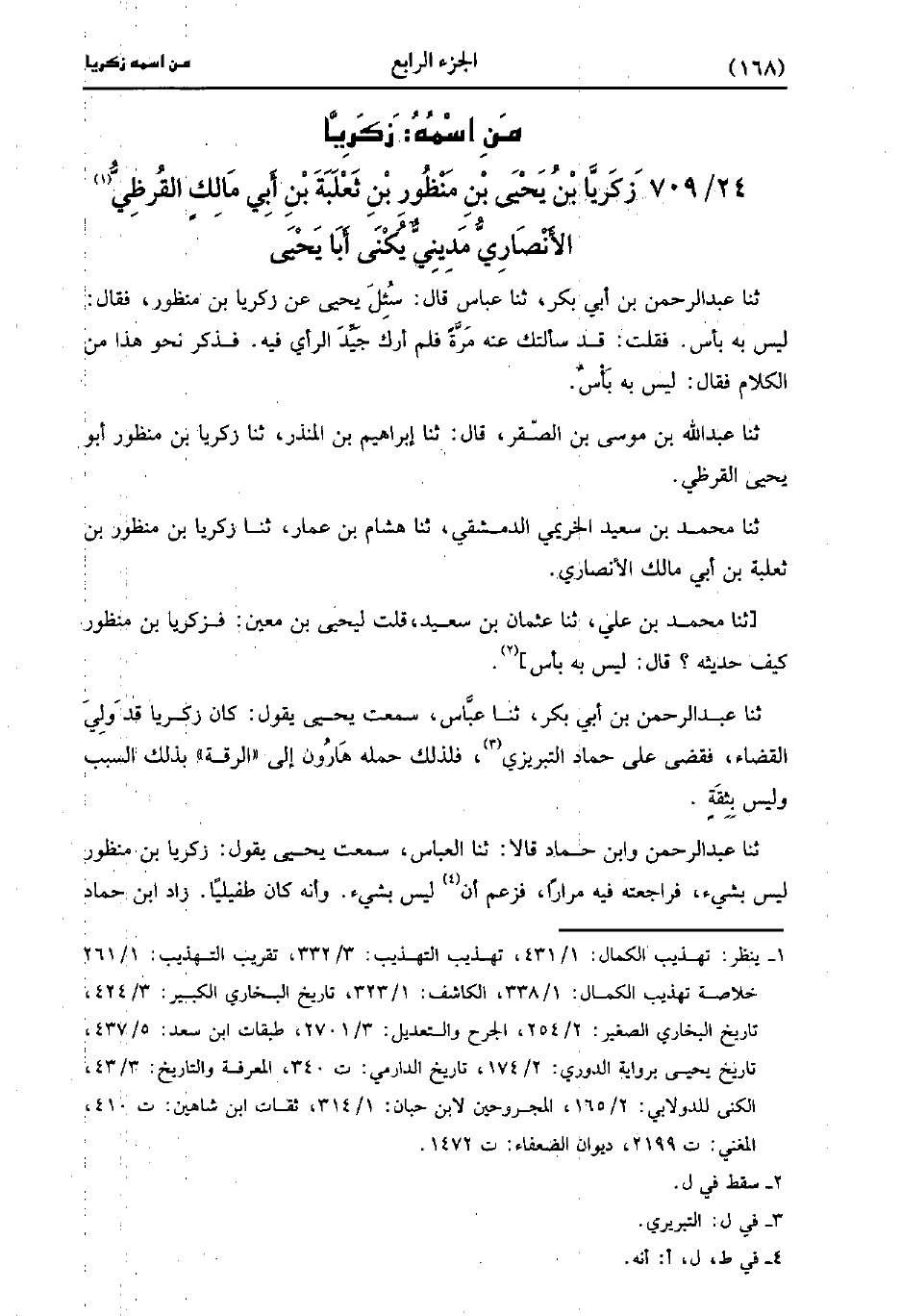 709- زَكَرِيَّا بْنُ يَحْيى بْنِ مَنْظُورٍ بْن ثعلبة بْن أبي مالك القرظي الأنصاري مديني، يُكَنَّى أبا يَحْيى.