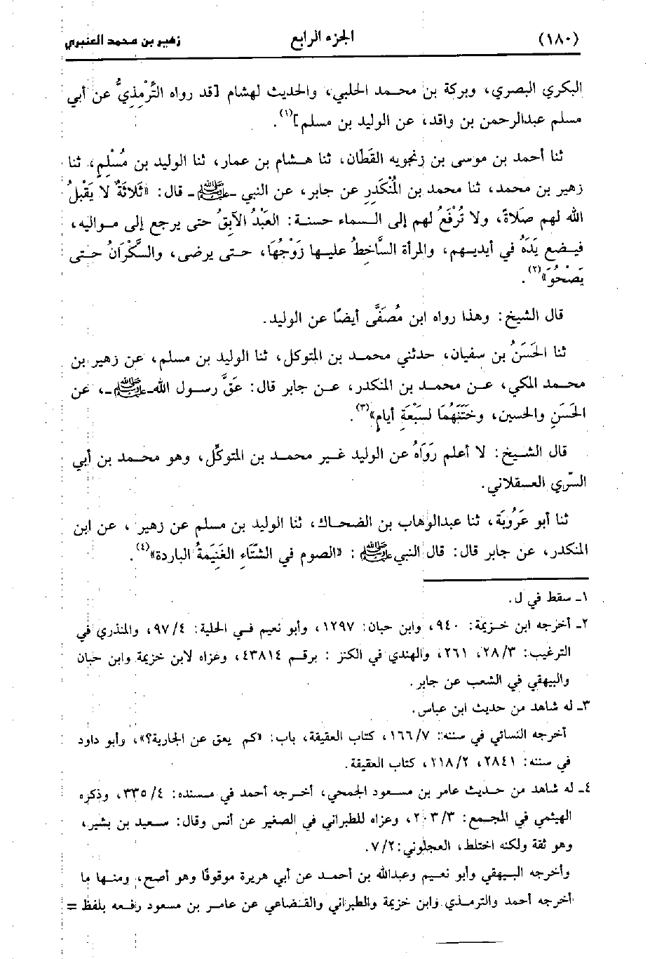 حَدَّثَنَا أَحْمَدُ بْنُ موسى بن زَنْجَوَيْهِ الْقَطَّانُ، حَدَّثَنا هِشَامُ بْنُ عَمَّارٍ، حَدَّثَنا الوليد بن مسلم، حَدَّثَنا زهير بْنُ مُحَمد، حَدَّثَنا مُحَمد بْنُ الْمُنْكَدِرِ عَنْ جَابِرٍ عَنِ النَّبِيِّ صَلَّى اللَّهُ عَلَيه وسَلَّم قَال: ثَلاثَةٌ لا يَقْبَلُ اللَّهُ لَهُمْ صَلاةٍ، ولاَ تُرْفَعُ لَهُمْ إِلَى السَّمَاءِ حَسَنَةً الْعَبْدُ الآبِقُ حَتَّى يَرْجِعَ إِلَى مُوَالِيهِ فَيَضَعُ يَدَهُ فِي أَيْدِيهِمْ وَالْمَرْأَةُ السَّاخِطُ عَلَيْهَا زَوْجَهَا حَتَّى يَرْضَى وَالسَّكْرَانُ حَتَّى يَصْحُو.