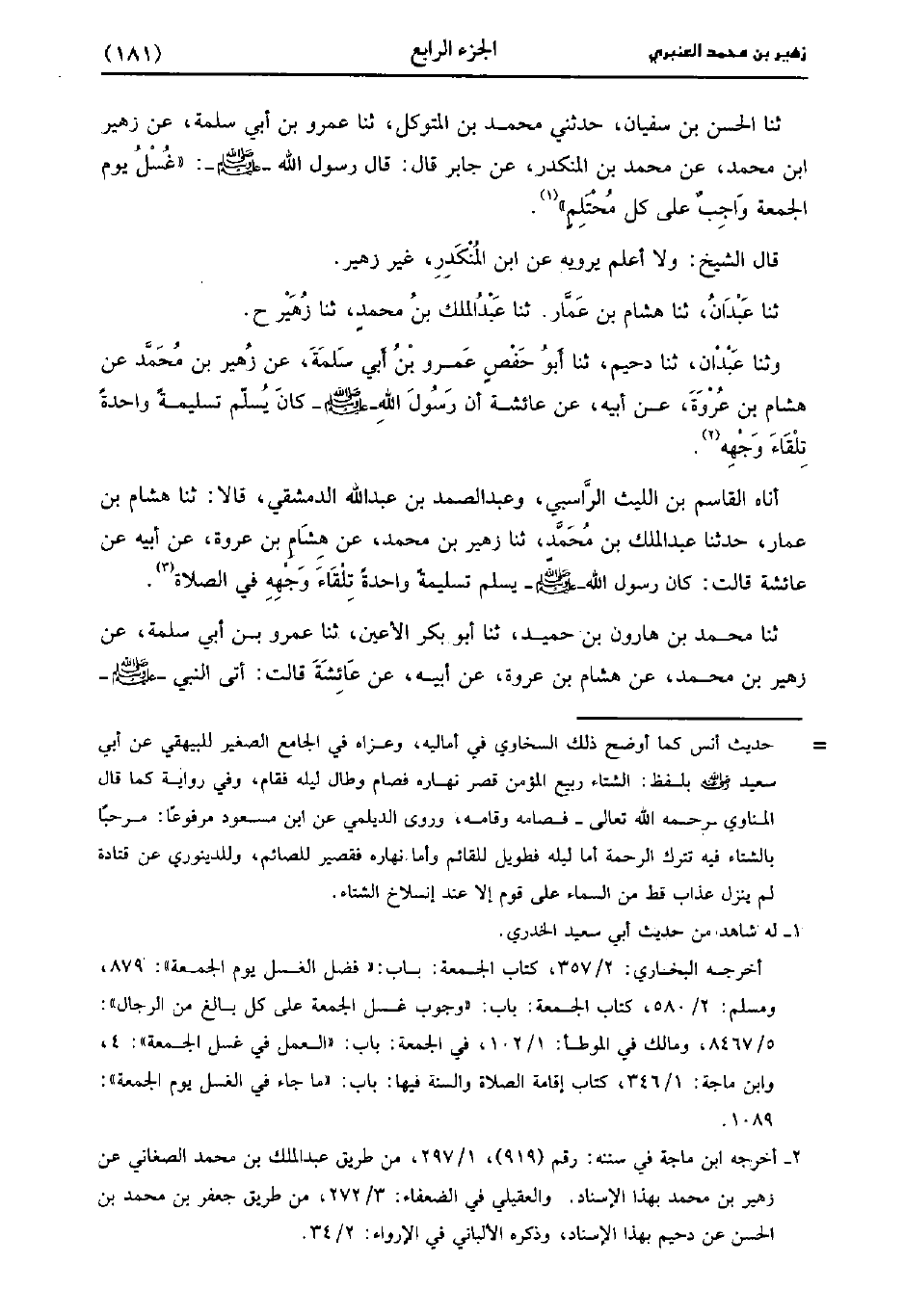 حَدَّثَنَا الحسن بن سفيان، حَدَّثني مُحَمد بن المتوكل، حَدَّثَنا عَمْرو بْنُ أَبِي سَلَمَةَ، عَنْ زُهَيْرِ بْنِ مُحَمد عَنْ مُحَمد بْنِ الْمُنْكَدِرِ عَنْ جَابِرٍ، قَال: قَال رَسُولُ اللَّهِ صَلَّى اللَّهُ عَلَيْهِ وَسَلَّمَ غُسْلُ يَوْمِ الْجُمُعَةِ وَاجِبٌ عَلَى كُلِّ مُحْتَلِمٍ.