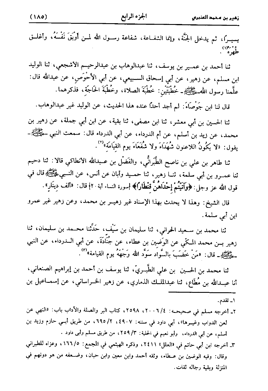 حَدَّثَنَا الْحُسَيْنُ بْنُ أَبِي مَعْشَرٍ، حَدَّثَنا ابن مصفى، حَدَّثَنا بَقِيَّةُ، عنِ ابْنِ أَبِي جَمَلَةَ عَنْ زُهَيْرِ بْنِ مُحَمد عَنْ زَيْدِ بْنِ أَسْلَمَ عَنْ أُمِّ الدَّرْدَاءَ، عَن أَبِي الدَّرْدَاءِ، قَالَ: سَمِعْتُ النَّبِيَّ صَلَّى اللَّهُ عَلَيهِ وَسلَّمَ يَقُولُ لا يَكُونُ اللاعِنُونَ شُهَدَاءَ، ولاَ شُفَعَاءَ يَوْمَ الْقِيَامَةِ.