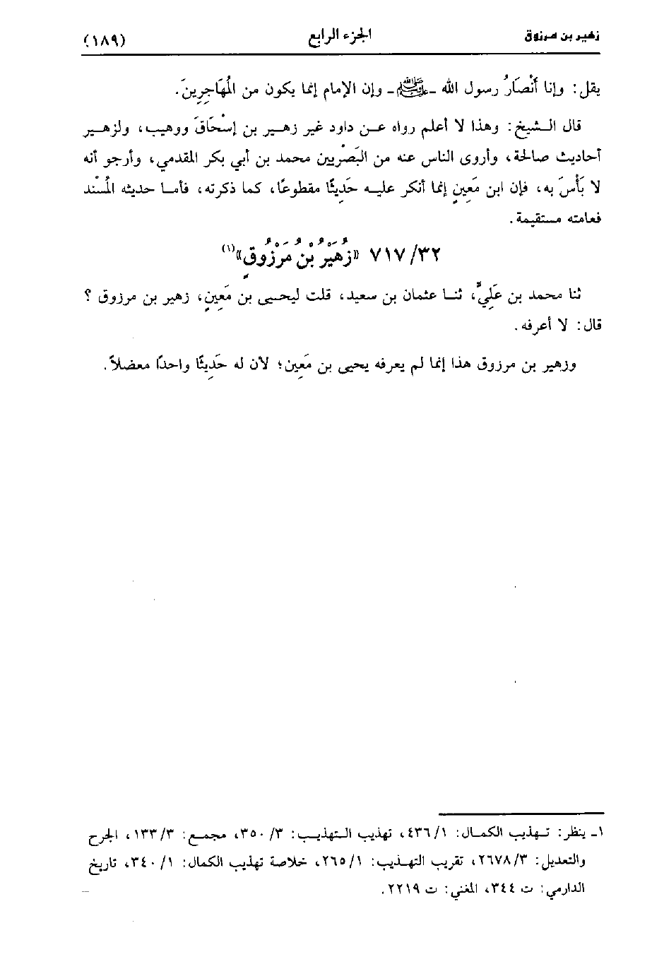 وزهير بْن مرزوق هذا إنما لم يعرفه يَحْيى بْن مَعِين لأن له حديثا واحدا معضلا