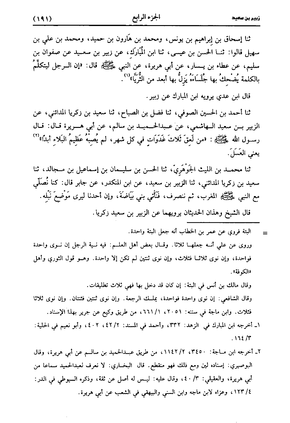 حَدَّثَنَا إِسْحَاقُ بْنُ إِبْرَاهِيمَ بْنُ يُونُس، وَمُحمد بْنُ هَارُونَ بْنِ حُمَيْدٍ، وَمُحمد بْنُ عَلِيِّ بْنِ سهيل قالوا، حَدَّثَنا الحسن بن عيسى، حَدَّثَنا ابْنُ الْمُبَارَكِ عَنْ زُبَيْرِ بْنِ سَعِيد عَنْ صَفْوَانَ بْنُ سُلَيْمٍ عَنْ عَطَاءِ بْنِ يَسَارٍ، عَن أَبِي هُرَيْرَةَ عَنِ النَّبِيِّ صَلَّى اللَّهُ عَلَيه وسَلَّم قَال: إِنَّ الرَّجُلَ لَيَتَكَلَّمُ بِالْكَلِمَةِ يُضْحِكُ بِهَا جُلَسَاءَهُ يَزَلَّ بِهَا أَبْعَدَ مِنَ الثُّرَيَّا.