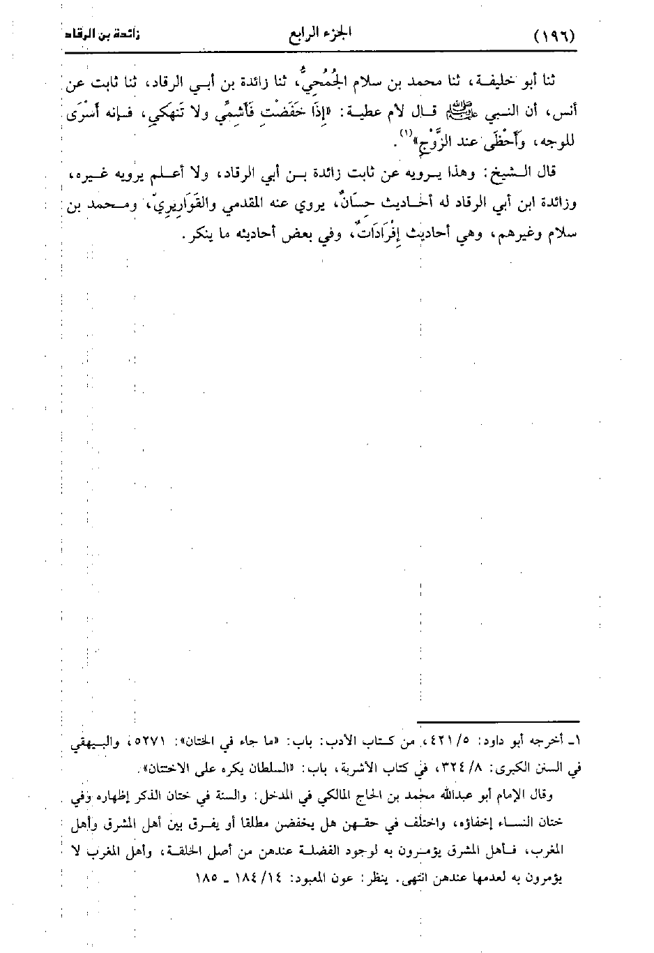 حَدَّثَنَا أبو خليفة، حَدَّثَنا مُحَمد بن سلام الجمحي، حَدَّثَنا زائدة بن أبي الرقاد، حَدَّثَنا ثَابِتٍ، عَن أَنَس أَنّ النَّبِيَّ صَلَّى اللَّهُ عَلَيه وسَلَّم قَال: لأُمِّ عَطِيَّةَ إِذَا خَفَضْتَ فَأَشِمِّي، ولاَ تَنْهَكِي فَإِنَّهُ أَسْرَى لِلْوَجْهِ وَأَحْظَى عِنْدَ الزَّوْجِ.
