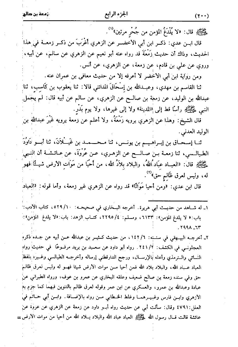 قَالَ ابنُ عَدِي، ومَنْ أَحْيَا مَوَاتًا قَدْ رَوَاهُ، عنِ الزُّهْريّ غَيْرُ زمعة وأما قوله العباد