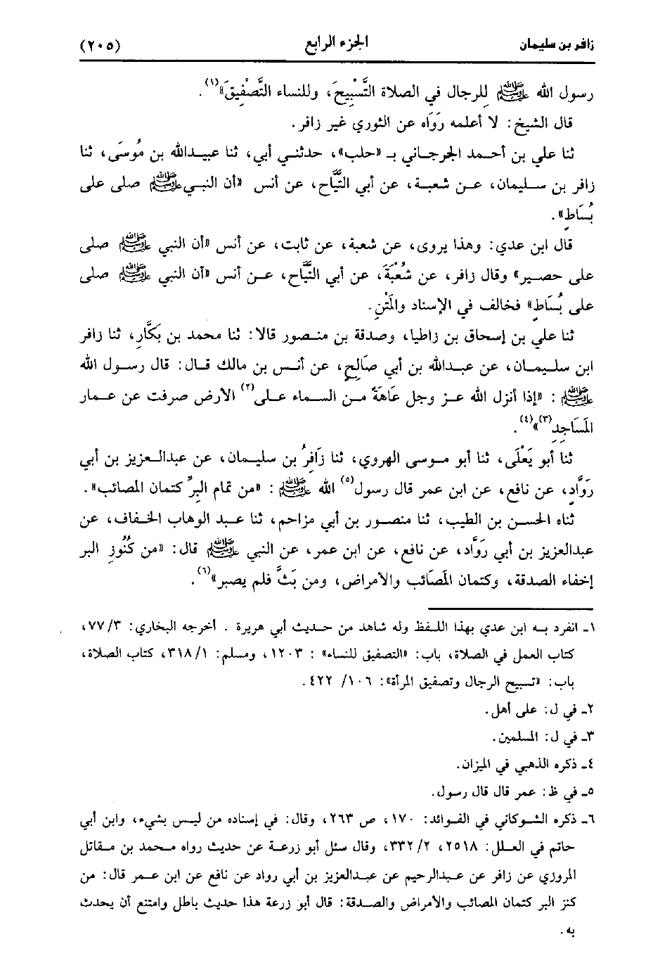 قَالَ ابنُ عَدِي وَهَذَا يَرْوِي عَنْ شُعْبَة عَنْ ثَابِتٍ، عَن أَنَس أَنّ النَّبِيَّ صَلَّى اللَّهُ عَلَيهِ وَسلَّمَ صَلَّى عَلَى حَصِيرٍ وَقَالَ زَافِرٌ عَنْ شُعْبَة، عَن أَبِي التَّيَّاحِ، عَن أَنَس أَنَّ النَّبِيَّ صَلَّى اللَّهُ عَلَيهِ وَسلَّمَ صَلَّى عَلَى بِسَاطٍ فَخَالَفَ فِي الإِسْنَادِ والمتن.