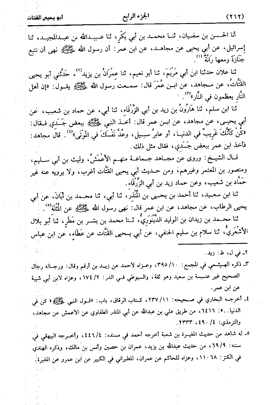 قال الشيخ: وروى عن مجاهد جماعة منهم الأَعْمَش ولَيْث بْن أبِي سُلَيم ومنصور بْن المعتمر وغيرهم ومن حديث أبي يَحْيى القتات أغرب، ولاَ يرويه عنه غير حماد بْن شُعَيب وعن حماد زيد بْن أبي الزرقاء.