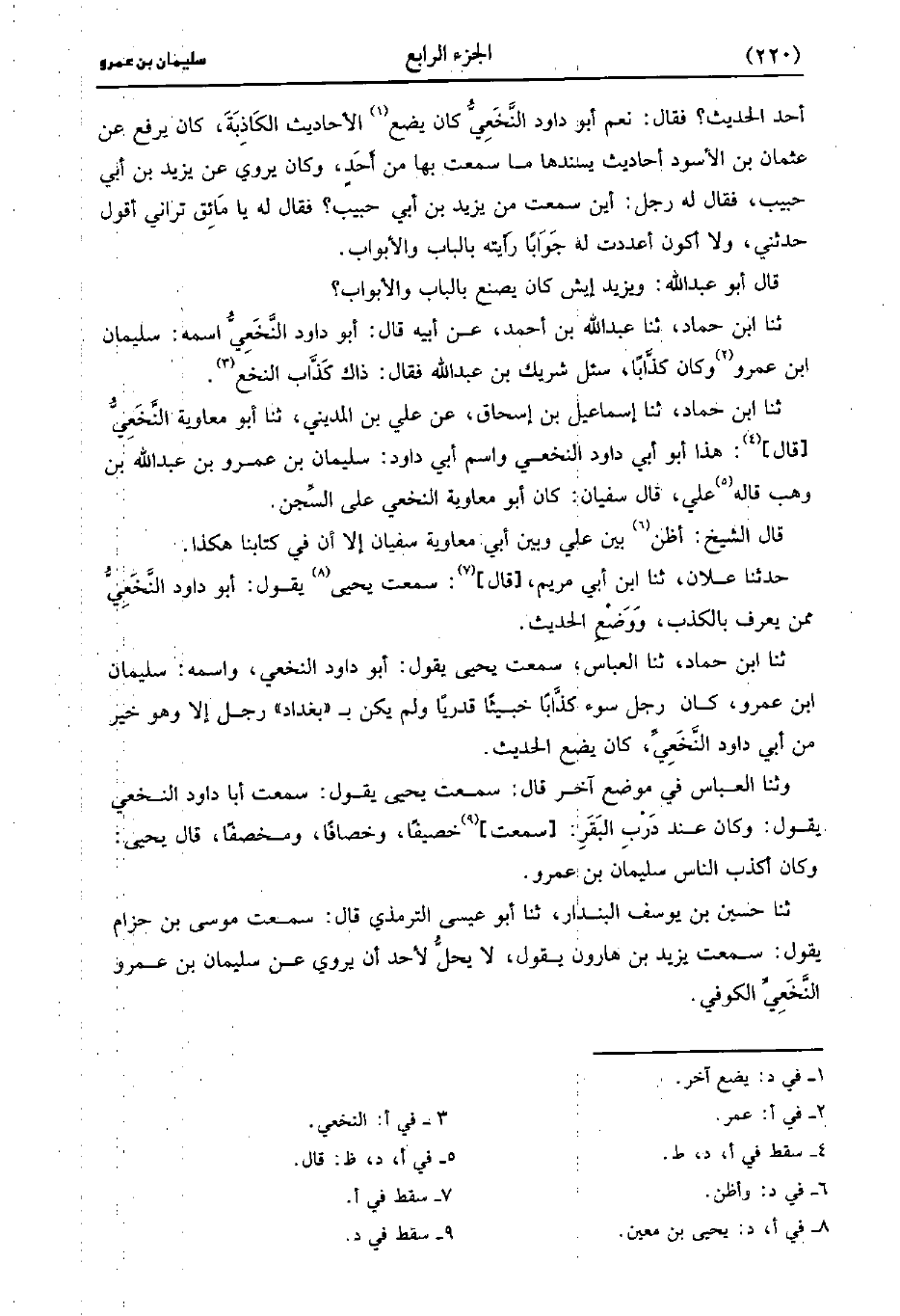 حَدَّثَنَا ابن حماد، حَدَّثَنا عَبد اللَّه بن أحمد، عن أبيه قال أبو داود النخعي اسمه سليمان بْن عَمْرو وكان كذَّابًا سئل شَرِيك بْن عَبد اللَّه فقال ذاك كذاب النخع.
