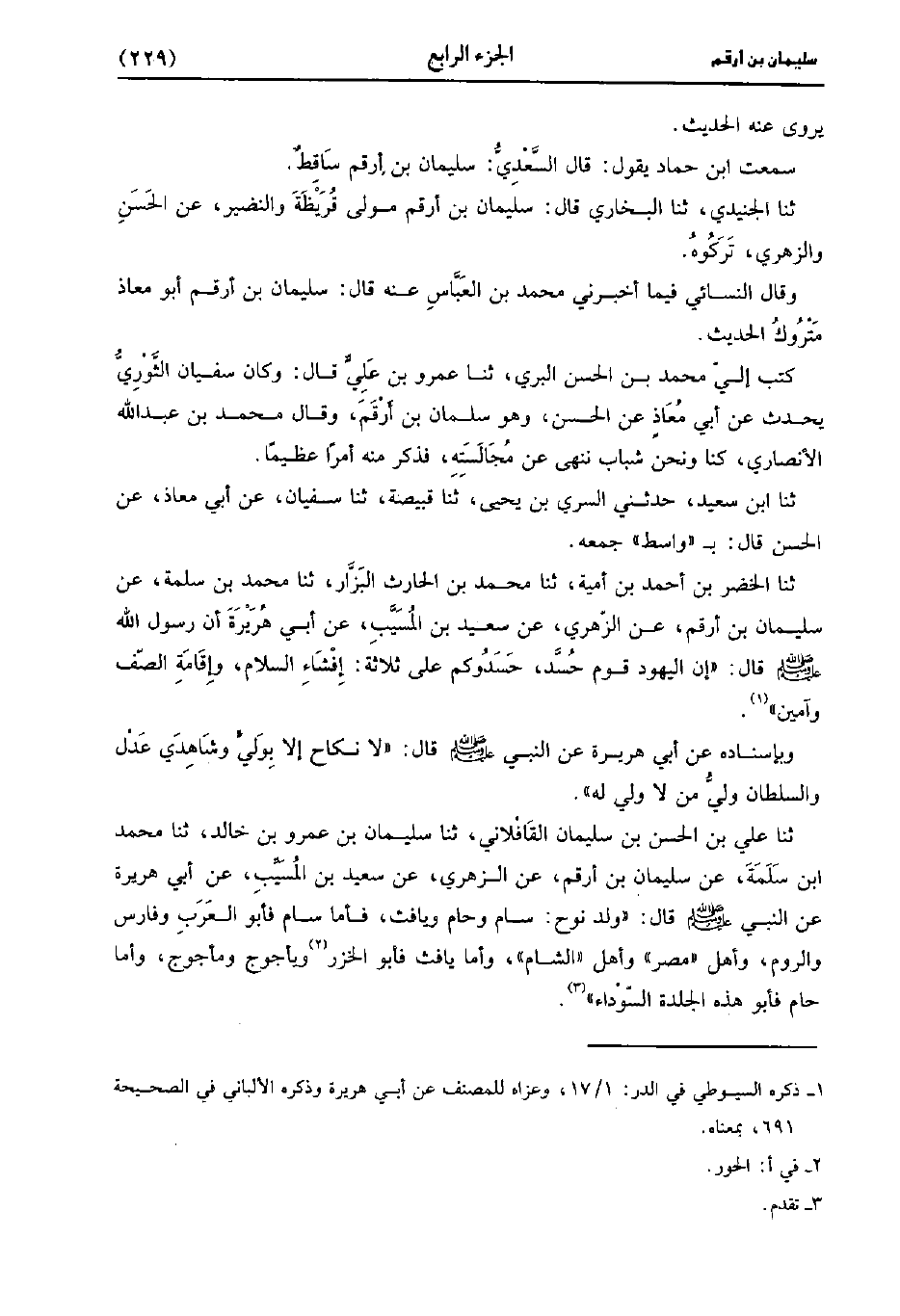 حَدَّثَنَا عَلِيُّ بْنُ الْحَسَنِ بْنِ سُلَيْمَانَ القافلاني، حَدَّثَنا سُلَيْمَانُ بْنُ عَمْرو بْنِ خَالِدٍ، حَدَّثَنا مُحَمد بْنُ سَلَمَةَ، عَنْ سُلَيْمَانَ بْنِ أَرْقَمٍ، عنِ الزُّهْريّ عَنْ سَعِيد بْنِ المُسَيَّب عَنْ النَّبِيُّ صَلَّى اللَّهُ عَلَيه وسَلَّم قَال: وَلَدُ نُوحٍ سَامٌ وَحَامٌ وَيَافِثُ فَأَمَّا سَامُ فَأَبُو الْعَرَبِ وَفَارِسُ وَالرُّومِ وَأَهْلُ مِصْرَ وَأَهْلُ الشَّامِ وَأَمَّا يَافِثُ فَأَبُو الْخَزَرِ وَيَأْجُوجَ وَمَأْجُوجَ وَأَمَّا حَامُ فَأَبُو هذه الجلدة السوداء