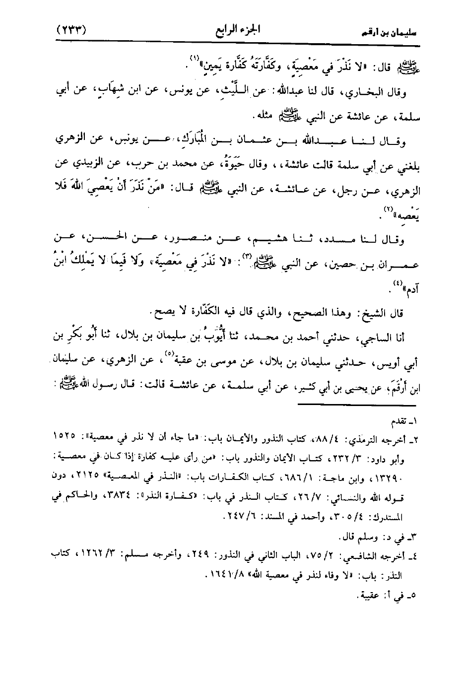 صَلَّى اللَّهُ عَلَيه وسَلَّم قَال: لا نَذْرٌ فِي مَعْصِيَةٍ وَكَفَّارَتُهُ كَفَّارَةُ يَمِينٍ.