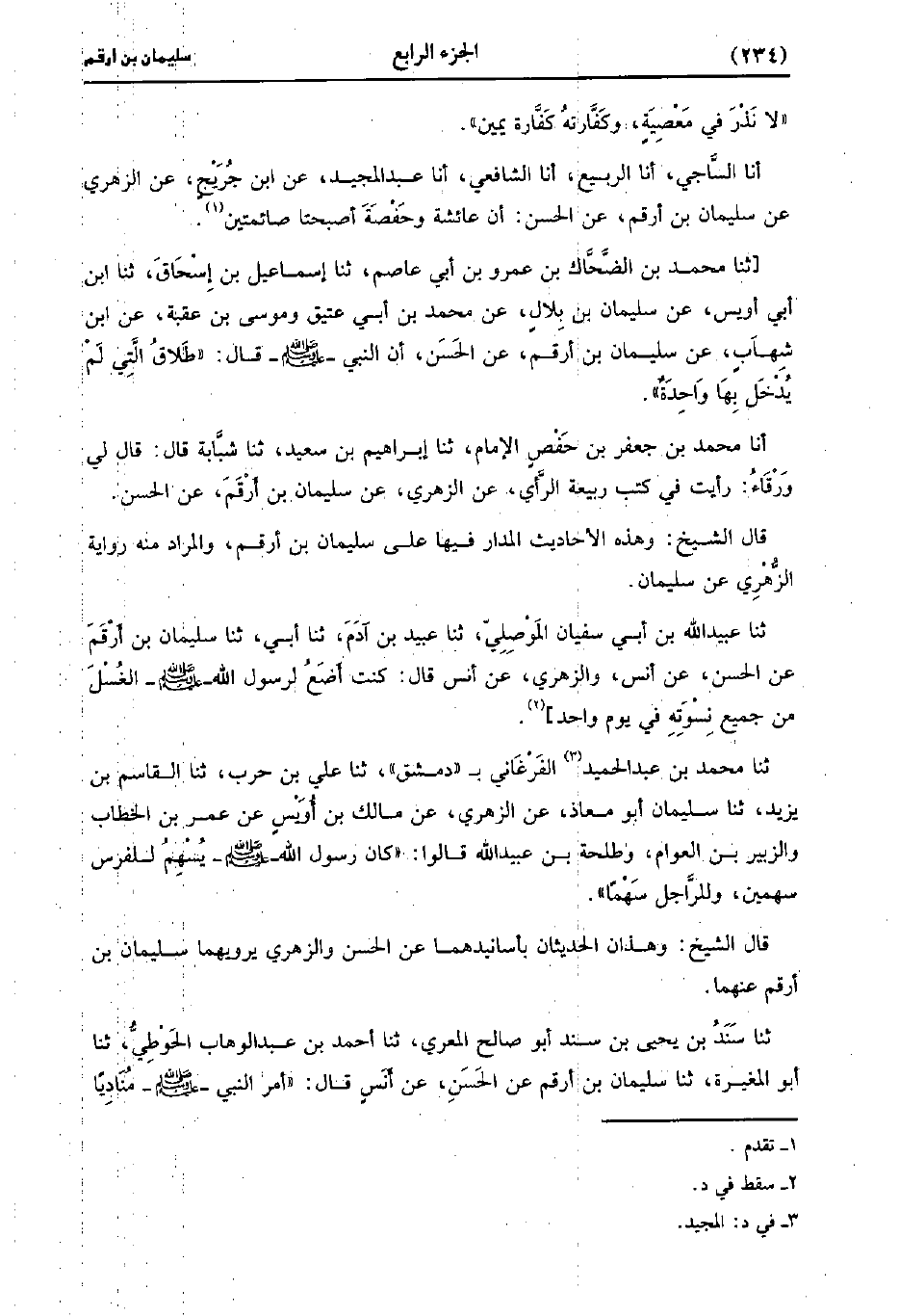 حَدَّثَنَا مُحَمد بْنُ جَعْفَرِ بْنِ حفص الإمام، حَدَّثَنا إِبْرَاهِيمُ بْنُ سَعِيد، حَدَّثَنا شَبَابَةُ، قَال: قَال لِي وَرْقَاءَ رَأَيْتُ فِي كُتُبِ رَبِيعَةَ الرَّأْيَ، عنِ الزُّهْريّ عَنْ سُلَيْمَانَ بْنِ أَرْقَمٍ عَنِ الْحَسَنِ.