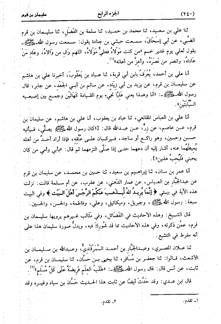 حَدَّثَنَا عَلِيُّ بْنُ الْعَبَّاسِ الْمُقَانِعِيُّ، حَدَّثَنا عَبَّادُ بْنُ يَعْقُوبَ أَنَا عَلِيُّ بْنُ هَاشِمٍ عَنْ سُلَيْمانَ بْنِ قرم عن عصام عَنْ زِرٍّ عَنْ عَبد اللَّهِ، قَال: كَانَ رَسُولُ اللَّهِ صَلَّى اللَّهُ عَلَيْهِ وَسَلَّمَ يُصَلِّي فَيَأْتِيهِ حَسَنٌ وَحُسَيْنٌ، وَهو رَاكِعٌ أَوْ سَاجِدٌ فَيَرْكَبَانِ عَلَى عُنُقِهِ فَإِذَا أَرَادَ أَحَدٌ مِنْ أَهْلِهِ يُمِيطُهُمَا عَنْهُ أَشَارَ إِلَيْهِ أَنْ دَعْهُمَا حَتَّى إِذَا صَلَّى الْتَزَمَهُمَا ثُمَّ قَالَ بِأَبِي وَأُمِّي مَنْ كَانَ يحبني فليحب هذين.