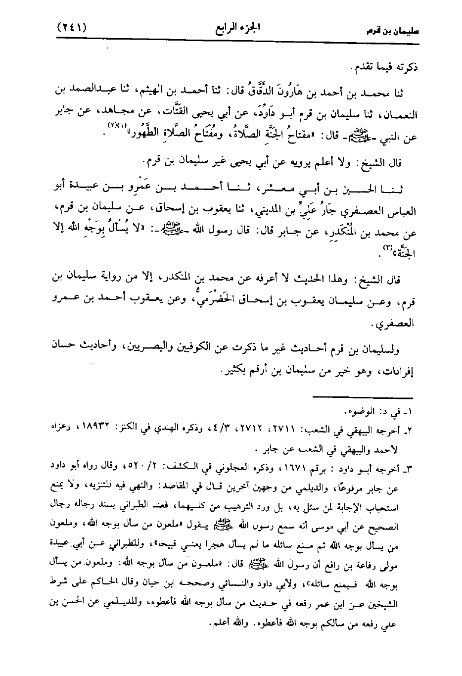 حَدَّثَنَا مُحَمد بْنُ أَحْمَدَ بْنِ هارون الدقاق، قَال: حَدَّثَنا أَحْمَدُ بْنُ الْهَيْثَمِ، حَدَّثَنا عَبد الصمد بن النعمان، حَدَّثَنا سُلَيْمَانُ بْنُ قَرْمٍ أَبُو دَاوُدَ، عَن أَبِي يَحْيى الْقَتَّاتِ عَنْ مُجَاهِدٍ عَنْ جَابِرٍ عَنِ النَّبِيِّ صَلَّى اللَّهُ عَلَيه وسَلَّم قَال: مِفْتَاحُ الْجَنَّةِ الصَّلاةُ وَمِفْتَاحُ الصَّلاةِ الطُّهُورُ.
