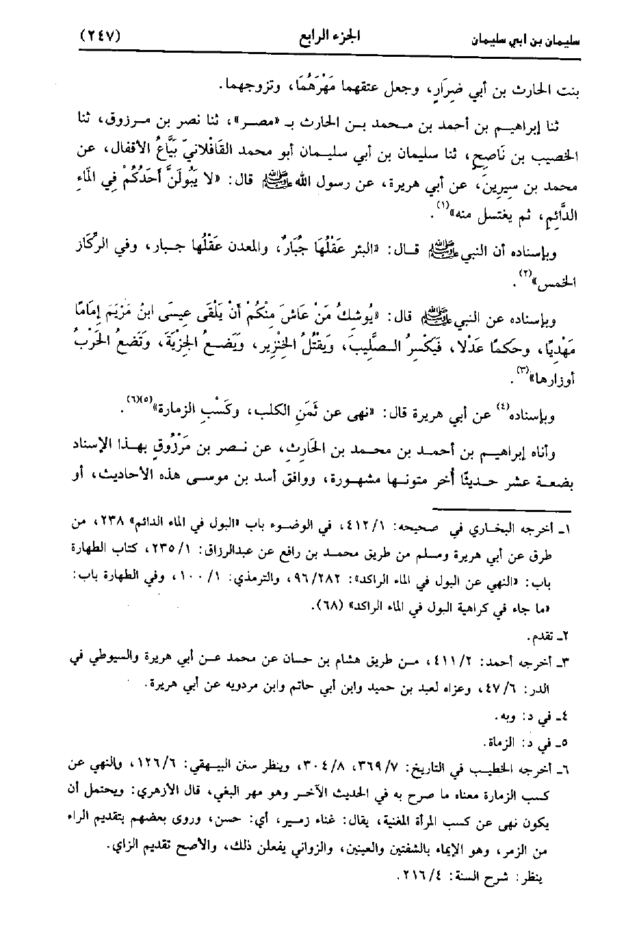 حَدَّثَنَا إبراهيم بن أحمد بن مُحَمد بن الحارث بمصر، حَدَّثَنا نصر بن مرزوق، حَدَّثَنا الخصيب بن ناصح، حَدَّثَنا سُلَيْمَانُ بْنُ أَبِي سُلَيْمَانَ أَبُو مُحَمد الْقَافْلانِيُّ بَيَّاعُ الأَقْفَالِ عَنْ مُحَمد بْنِ سِيرِين، عَن أَبِي هُرْيَرَةَ عَنْ رَسُولِ اللَّهِ صَلَّى الله عَلَيْهِ وَسَلَّمَ صَلَّى اللَّهُ عَلَيه وسَلَّم قَال: لا يَبُولَنَّ أَحَدُكُمْ فِي الْمَاءِ الدَّائِمِ ثُمَّ يَغْتَسِلُ مِنْهُ.