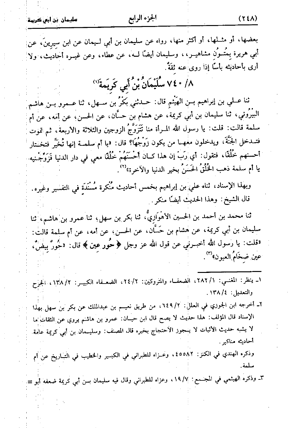 حَدَّثَنَا مُحَمد بْنُ أَحْمَدَ بن الحسين الأهوازي، حَدَّثَنا بكر بن سهل، حَدَّثَنا عَمْرو بن هاشم، حَدَّثَنا سُلَيْمَانُ بْنُ أَبِي كَرِيمَةَ عَنْ هِشَامِ بْنِ حَسَّانَ عَنِ الْحَسَنِ، عَن أُمِّهِ عَنْ أُمِّ سَلَمَةَ قَالَتْ قُلْتُ يَا رَسُولَ اللهِ أَخْبِرْنِي عَنْ قَوْلِ اللَّهِ عَزَّ وَجَلَّ حور عين قال حور بيض كعين ضخام العيون