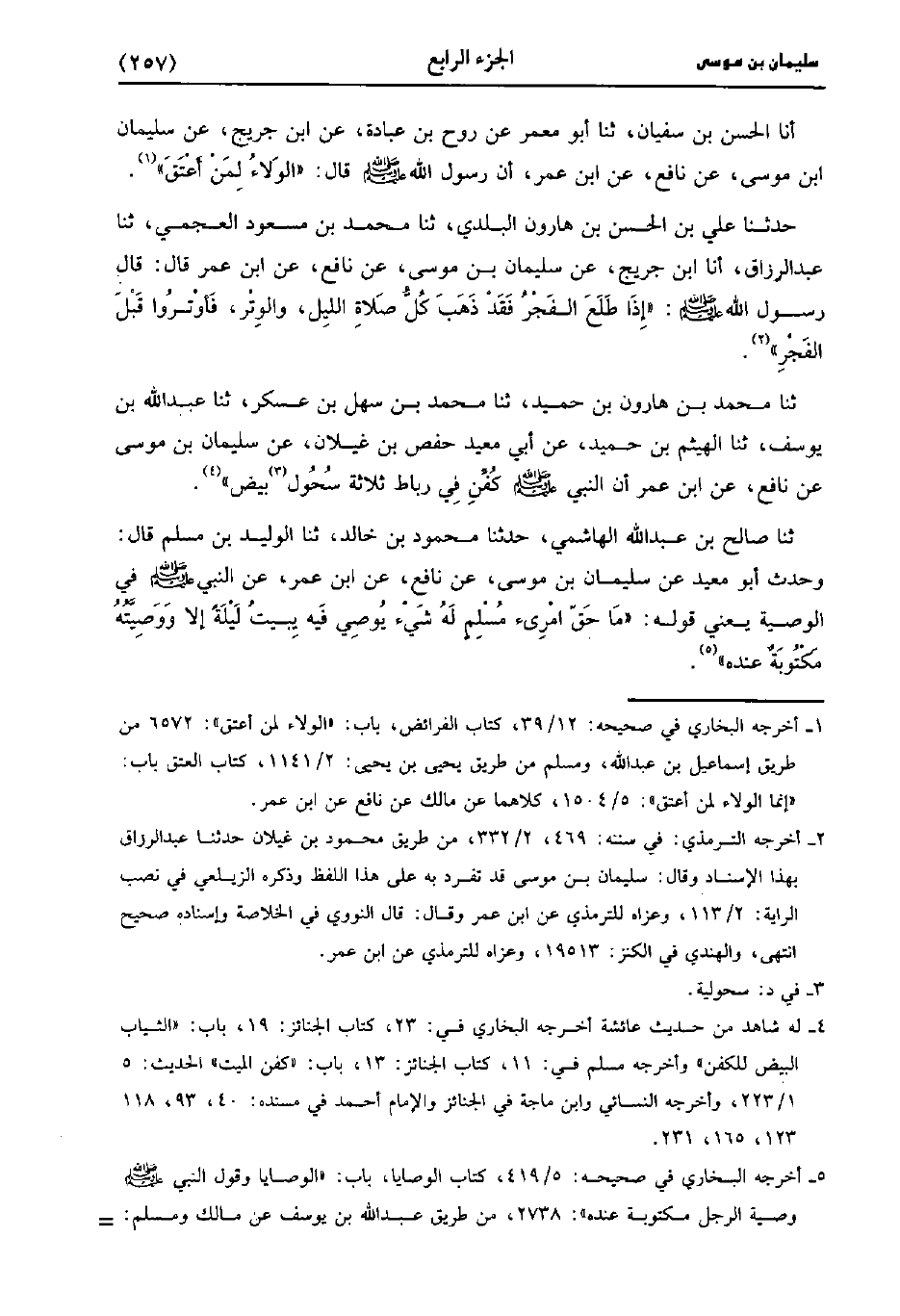 أنا الْحَسَنُ بْنُ سُفْيَانَ، حَدَّثَنا أَبُو مَعْمَرٍ عَنْ رُوحِ بْنِ عُبَادَةَ، عنِ ابْنِ جُرَيج، عَن سُلَيْمَانَ بْنِ مُوسَى عَنْ نَافِعٍ، عنِ ابْنِ عُمَر أَنَّ رَسُولَ اللَّهِ صَلَّى اللَّهُ عَلَيْهِ وَسَلَّمَ صَلَّى اللَّهُ عَلَيه وسَلَّم قَال: الْوَلاءُ لِمَنْ أَعْتَقَ.