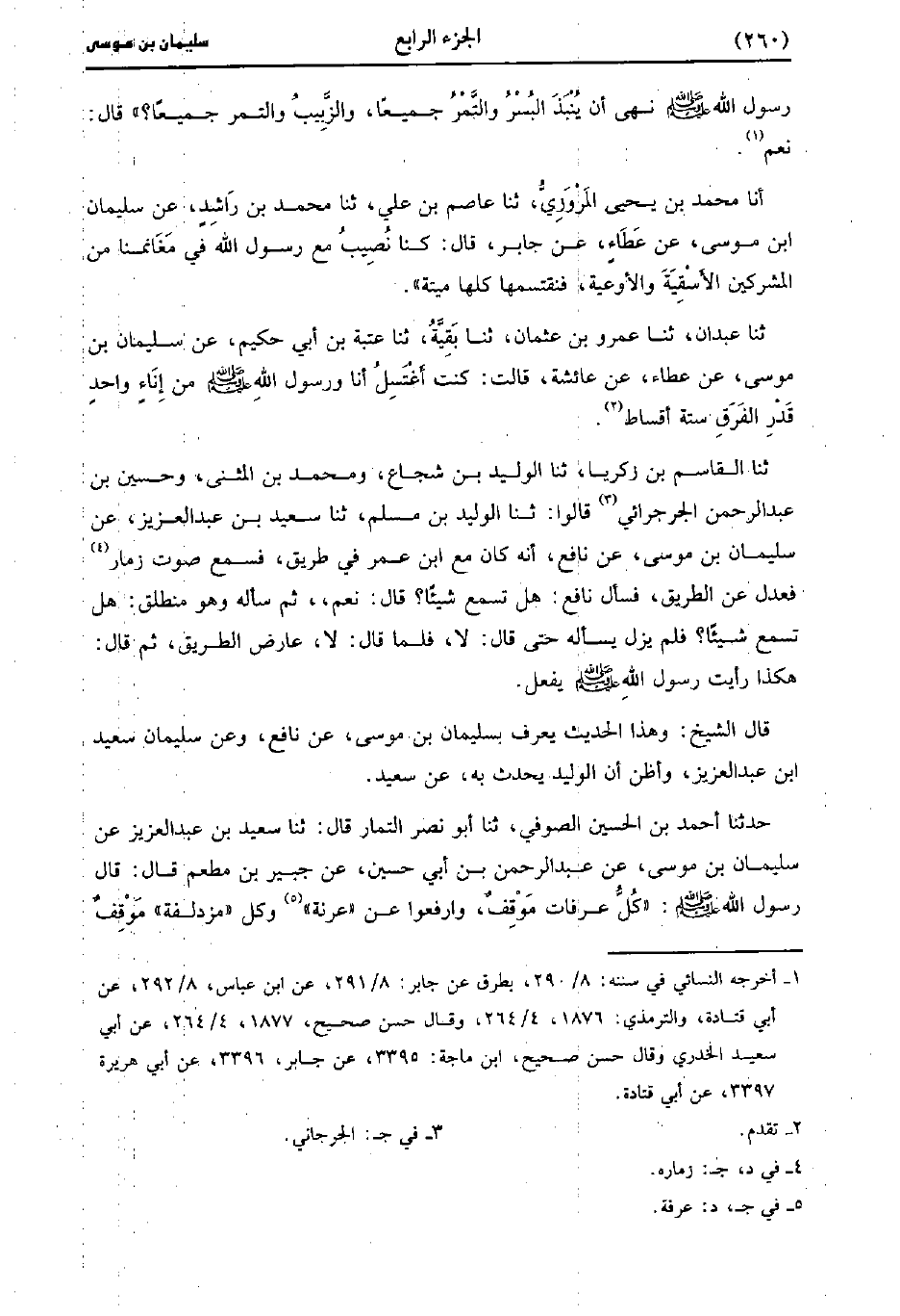 حَدَّثَنَا الْقَاسِمُ بْنُ زَكَرِيَّا، حَدَّثَنا الْوَلِيدُ بْنُ شُجَاعٍ، وَمُحمد بْنُ الْمُثَنَّى وَحُسَيْنُ بْنُ عَبد الرَّحْمَنِ الجرجرائي قالوا، حَدَّثَنا الوليد بن مسلم، حَدَّثَنا سَعِيد بْنِ عَبد الْعَزِيزِ عَنْ سُلَيْمَانَ بْنِ مُوسَى عَنْ نَافِعٍ أنه كان مع بن عُمَر فِي طَرِيقٍ فَسَمِعَ صَوْتَ زَمَّارٍ فَعَدَلَ عَنِ الطَّرِيقِ فَسَأَلَ نافع هَلْ تَسْمَعُ شَيْئًا؟ قَال: نَعم ثُمَّ سَأَلَ، وَهو مُنْطَلِقٌ هَلْ تَسْمَعُ شَيْئًا فَلَمْ يَزَلْ يَسْأَلُهُ حَتَّى؟ قَال: لاَ فَلَمَّا؟ قَال: لاَ عَارَضَ الطَّرِيقَ ثُمَّ قَالَ هَكَذَا رَأَيْتُ رَسُولَ اللَّهِ صَلَّى اللَّهُ عَلَيْهِ وَسَلَّمَ يَفْعَلُ.