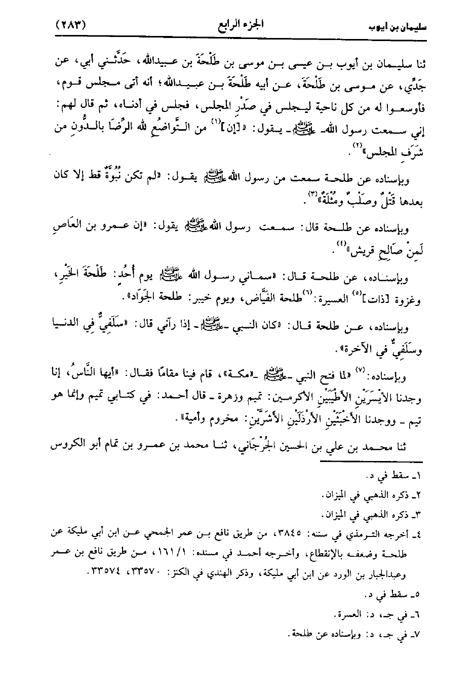 - وَبِإِسْنَادِهِ؛ عَنْ طَلْحَةَ، قَال: كَانَ النَّبِيُّ صَلَّى اللَّهُ عَلَيهِ وَسلَّمَ إِذَا رَآنِي قَالَ سَلَفِيٌّ فِي الدُّنْيَا وَسَلَفِيٌّ فِي الآخِرَةِ.
