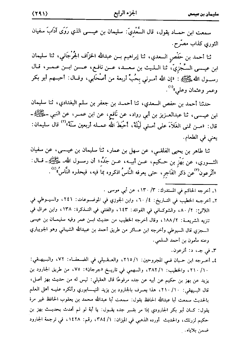 حَدَّثَنَا أَحْمَدُ بْنُ حَفْصٍ السَّعْدِيُّ، حَدَّثَنا إِبْرَاهِيمُ بْنُ عَبد اللَّهِ الخزاف الجرجاني، حَدَّثَنا سليمان بن عيسى السجزي، حَدَّثَنا اللَّيْثُ بْنُ سَعْدٍ عَنْ نَافِعٍ، عنِ ابْنِ عُمَر قَال رَسُول اللهِ صَلَّى اللَّهُ عَلَيهِ وَسلَّمَ إِنَّ اللَّهَ أَمَرَنِي بِحُبِّ أَرْبَعَةٍ مِنْ أَصْحَابِي وَقَالَ أَحِبَّهُمْ أبو بكر وعمر وعثمان وعلي.