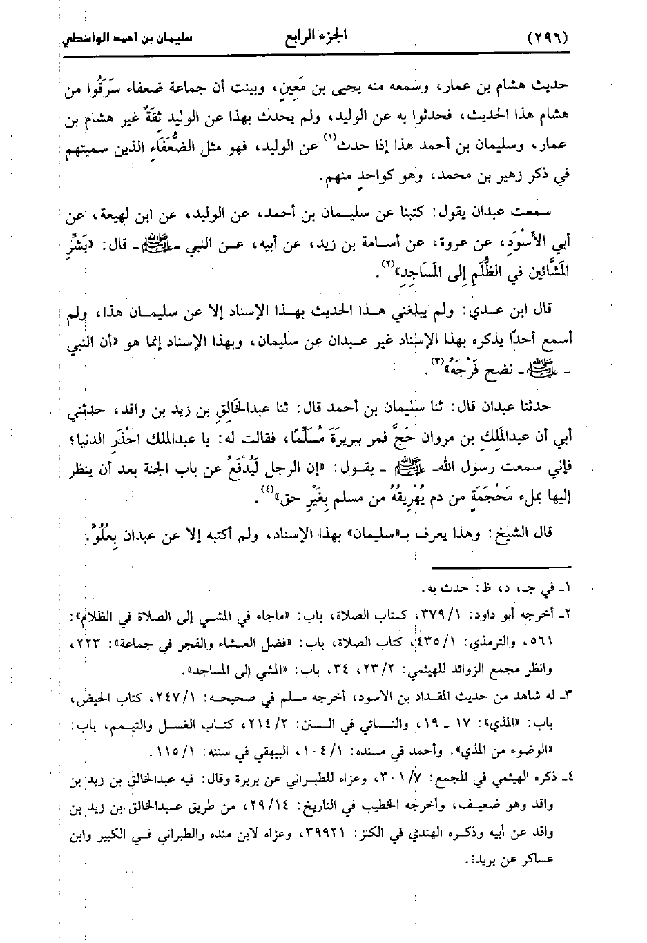سَمِعْتُ عَبْدَانَ يَقُولُ كَتَبْنَا عَنْ سُلَيْمَانَ بْنِ أَحْمَدَ عَنِ الْوَلِيدِ، عنِ ابْنِ لَهِيعَة، عَن أَبِي الأَسْوَدِ عَنْ عُرْوَةَ عَنْ أُسَامَةَ بْنِ زَيْدٍ، عَنْ أَبِيهِ عَنِ النَّبِيِّ صَلَّى اللَّهُ عَلَيه وسَلَّم قَال: بَشِّرِ الْمَشَّائِينَ فِي الظُّلَمِ إِلَى الْمَسَاجِدِ.