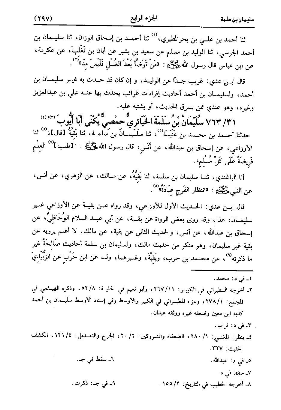 قَالَ ابنُ عَدِي الْحَدِيثُ الأَوَّلُ لِلأَوْزَاعِيِّ وَقَدْ رَوَاهُ عَنْ بَقِيَّةَ عَنِ الأَوْزاعِيّ غَيْرُ سُلَيْمَانَ هذا وقد روى بعض الرواة عن بقية، عَن أبي عَبد السلام الوحاظي عَنْ إِسْحَاقَ بْنِ عَبد اللَّهِ، عَن أَنَس والحديث الثاني عن بقية عن مالك لا أعلم يرويه عن بقية غير سُلَيْمَان، وَهو منكر من حديث مالك ولسُلَيْمَان بْن سلمة أحاديث صالحة غير ما ذكرته عن مُحَمد بْن حرب وبقية وغيرهما وله، عنِ ابْن حرب عن الزبيدي