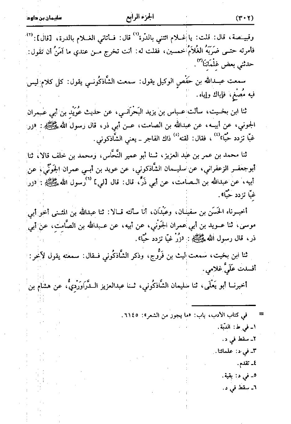 أَخْبَرَنَاهُ الْحَسَنُ بْنُ سُفْيَانَ وَعَبْدَانُ أنا سألته، قَالا: حَدَّثَنا عَبد اللَّهِ بْنُ المثنى أخو أبي موسى، حَدَّثَنا عُوَيْدِ بْنِ أَبِي عِمْرَانَ الْجَوْنِيِّ، عَنْ أَبِيهِ عَنْ عَبد اللَّهِ بْنِ الصَّامِتِ، عَن أَبِي ذَرٍّ قَال رَسُول اللهِ صَلَّى اللَّهُ عَلَيهِ وَسلَّمَ زُرْ غِبًّا تَزْدَدْ حبا.