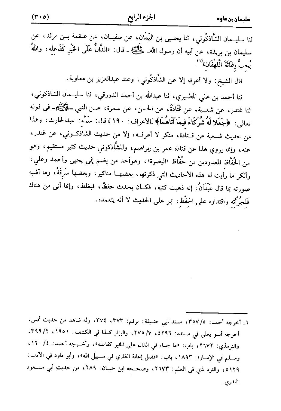 حَدَّثَنَا أَحْمَدُ بْنُ عَلِيٍّ الْمَطِيرِيُّ، حَدَّثَنا عَبد اللَّهِ بْنُ أَحْمَدَ الدورقي، حَدَّثَنا سليمان الشاذكوني، حَدَّثَنا غُنْدَرٌ عَنْ شُعْبَة، عَن قَتادَة عَنِ الْحَسَنِ، عَن سَمُرَةَ عَنِ النَّبِيُّ صَلَّى اللَّهُ عَلَيهِ وَسلَّمَ في قوله جَعَلا لَهُ شُرَكَاءَ فِيمَا آتَاهُمَا قَالَ سَمِّهِ عَبد الْحَارِثِ وَهَذَا مِنْ حَدِيثِ شُعْبَة، عَن قَتادَة مُنْكَرٌ لا أَعْرِفُهُ إلاَّ مِنْ حَدِيثِ الشَّاذَكُونِيِّ عَنْ غُنْدَرٍ عَنْهُ وَإِنَّمَا يَرْوِي هَذَا، عَن قَتادَة عُمَر بْنُ إِبْرَاهِيمَ وَلِلشَّاذَكُونِيِّ حَدِيثٌ كَثِيرٌ مُسْتَقِيمٌ، وَهو مِنَ الْحُفَّاظِ الْمَعْدُودِينَ مِنْ حُفَّاظِ الْبَصْرَةِ، وَهو أَحَدُ من يضم إلى يَحْيى وأحمد، وَعلي وأنكر ما رأيت هذه الأحاديث التي ذكرتها بعضها مناكير وبعضها سرقة وما أشبه صورة أمره بما قال عبدان إنه ذهبت كتبه فكان يحدث حفظا فيغلظ وإنما أتى من هناك يشتبه عليه فلجرأته واقتداره على الحفظ يمر على الحديث لا أنه يتعمده