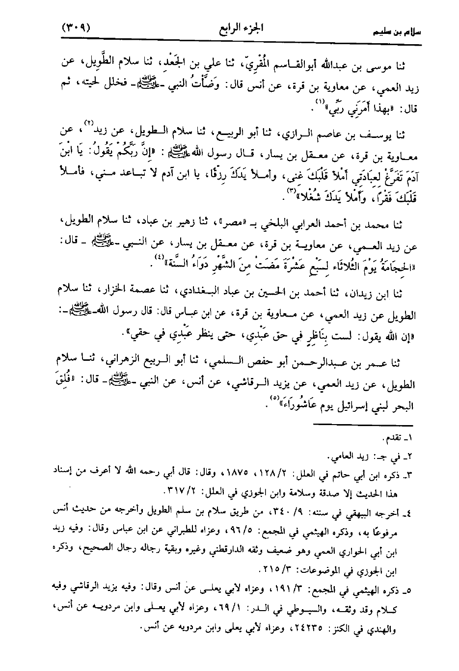 حَدَّثَنَا ابن زيدان، حَدَّثَنا أَحْمَدُ بْنُ الْحُسَيْنِ بْنِ عباد البغدادي، حَدَّثَنا عصمة الخزاز، حَدَّثَنا سلام الطويل عن زيد العمي عَنْ مُعَاوِيَةَ بْنِ قُرَّةَ، عنِ ابْنِ عَبَّاسٍ، قَال: قَال رَسُولُ اللَّهِ صَلَّى اللَّهُ عَلَيْهِ وَسَلَّمَ إِنَّ اللَّهَ يَقُولُ لَسْتُ بِنَاظِرٍ فِي حَقِّ عَبْدِي حَتَّى يَنْظُرَ عبدي في حقي.