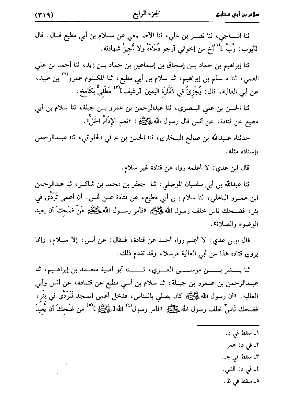 حَدَّثَنَا عَبد اللَّهِ بْنُ أَبِي سفيان الْمَوْصِلِيُّ، حَدَّثَنا جَعْفَرُ بْنُ مُحَمد بن شاكر، حَدَّثَنا عَبد الرَّحْمَنِ بْنُ عَمْرو الباهلي، حَدَّثَنا سَلامُ بْنُ أَبِي مُطِيعٍ، عَن قَتادَة، عَن أَنَس أَنَّ أَعْمَى تَرَدَّى فِي بِئْرٍ فَضَحِكَ نَاسٌ خَلْفَ رَسُولِ اللَّهِ صَلَّى اللَّهُ عَلَيْهِ وَسَلَّمَ فَأَمَرَ رَسُولُ اللَّهِ صَلَّى اللَّهُ عَلَيْهِ وَسَلَّمَ مِنَ ضَحِكَ أَنْ يُعِيدَ الْوُضُوءَ وَالصَّلاةَ.