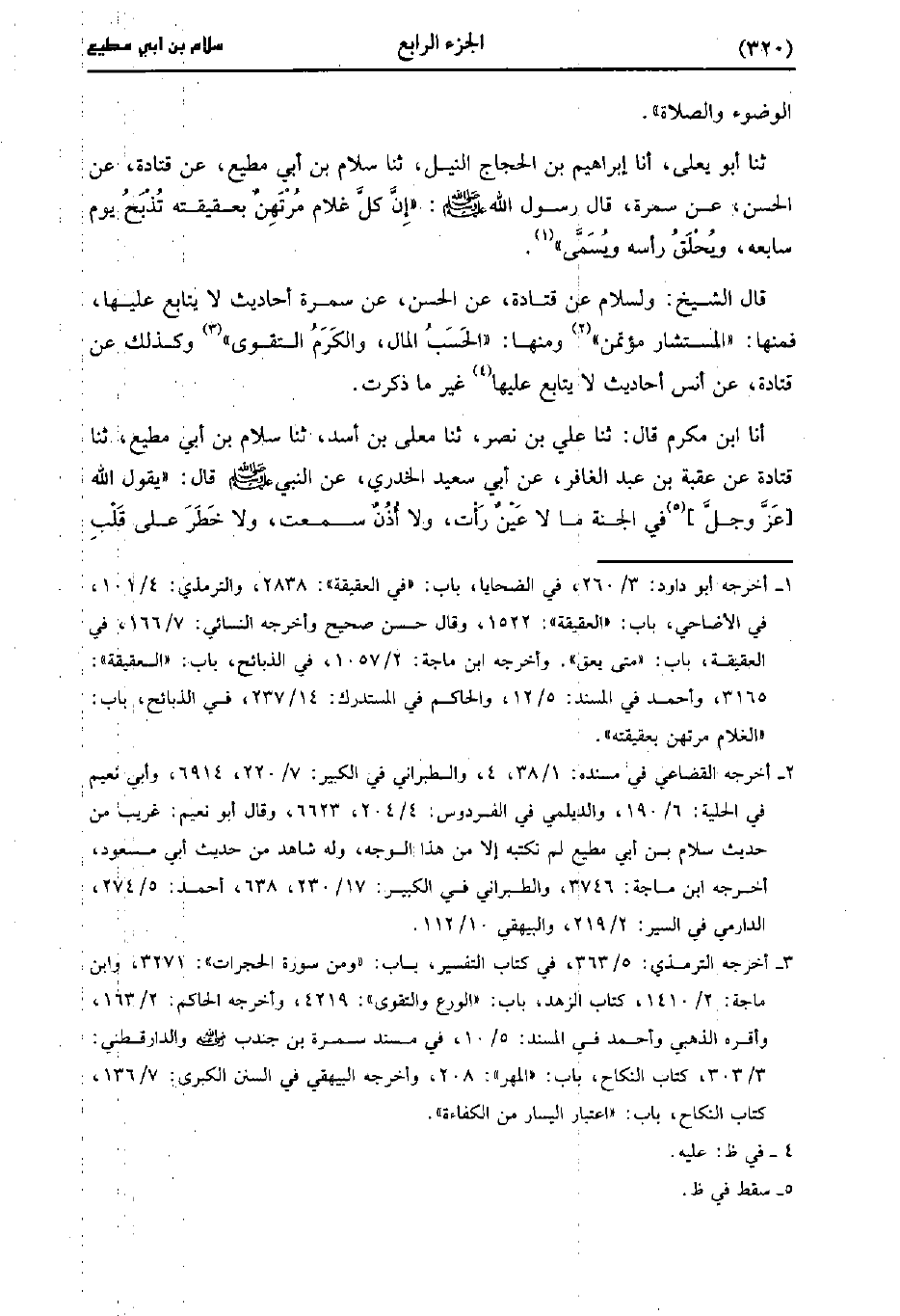 حَدَّثَنَا أَبُو يَعْلَى أَنَا إِبْرَاهِيمُ بْنُ الحجاج النيلي، حَدَّثَنا سَلامُ بْنُ أَبِي مُطِيعٍ، عَن قَتادَة عَنِ الْحَسَنِ، عَن سَمُرَةَ قَال رَسُول اللهِ صَلَّى اللَّهُ عَلَيهِ وَسلَّمَ إِنَّ كُلَّ غُلامٍ مُرْتَهَنٌ بِعَقِيقَتِهِ تُذْبَحُ يَوْمَ سَابِعِهِ وَيُحْلَقُ رَأْسُهُ وَيُسَمَّى.