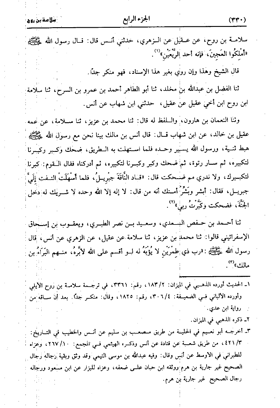 حَدَّثَنَا الفضل بن عَبد اللَّه بن مخلد، حَدَّثَنا أَبُو الطَّاهِرِ أَحْمَدُ بْنُ عَمْرو بن السرح، حَدَّثَنا سَلامَةُ بْنُ رَوْحِ بْنِ أَخِي عقيل عقيل عن، حَدَّثني ابْنُ شِهَابٍ، عَن أَنَس (ح) وحدثنا النُّعْمَانُ بْنُ هَارُونَ وَاللَّفْظُ لَهُ، قَال: حَدَّثَنا مُحَمد بن عزيز، حَدَّثَنا سَلامَةُ، عَن عَمِّه عُقَيْلِ بْنِ خَالِدٍ، عنِ ابْنِ شِهَابٍ، قَال: قَال أَنَسُ بْنُ مَالِكٍ بَيْنَا نَحْنُ مَعَ رَسُولِ اللَّهِ صَلَّى اللَّهُ عَلَيْهِ وَسَلَّمَ هَبَطَ ثَنْيَةً وَرَسُولُ اللَّهِ يَسِيرُ وَحْدَهُ فَلَمَّا اسْتَهَلَّتْ بِهِ الطَّرِيقُ ضَحِكَ وَكَبَّرَ وَكَبَّرْنَا لِتَكْبِيرِهِ ثُمَّ سَارَ رَتْوَةً ثُمَّ ضَحِكَ وَكَبَّرَ وَكَبَّرْنَا لِتَكْبِيرِهِ ثُمَّ أَدْرَكْنَاهُ فَقَالَ الْقَوْمُ كَبَّرْنَا لِتَكْبِيرِكَ، ولاَ نَدْرِي مِمَّ ضَحِكْتَ قَالَ قَادَ النَّاقَةُ جِبْرِيلُ فَلَمَّا أَسْهَلْتُ الْتَفَتَ إِلَيَّ جِبْرِيلُ فَقَالَ أَبْشِرْ وَبَشِّرْ أُمَّتَكَ أَنَّهُ مَنْ؟ قَال: لاَ إِلَهَ إلاَّ اللَّهُ وَحْدَهُ لا شَرِيك لَهُ دَخَلَ الجنة فضحكت وكبرت ربي.