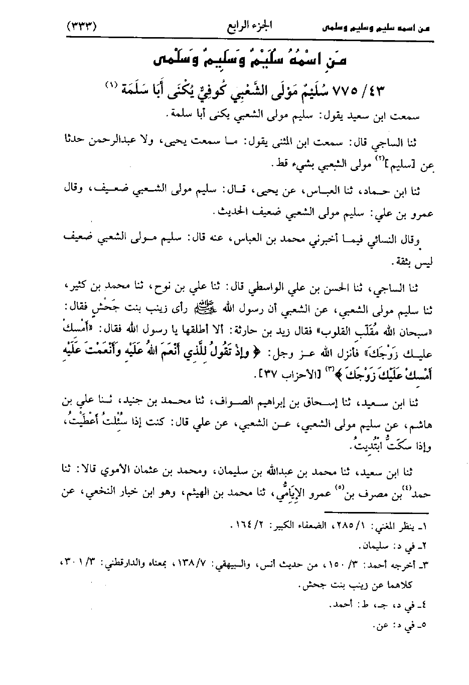 - حَدَّثَنَا السَّاجِيُّ، حَدَّثَنا الْحَسَنُ بْنُ عَلِيٍّ الواسطي، قَال: حَدَّثَنا علي بن نوح، حَدَّثَنا مُحَمد بْنُ كَثِيرٍ، حَدَّثَنا سُلَيمٌ مَوْلَى الشَّعْبِيِّ عَنِ الشَّعْبِيِّ إِنَّ رَسُولَ اللَّهِ صَلَّى اللَّهُ عَلَيْهِ وَسَلَّمَ رَأَى زَيْنَبَ بِنْتَ جَحْشٍ فَقَالَ سُبْحَانَ اللَّهِ مُقَلِّبِ الْقُلُوبِ فَقَالَ زَيْدُ بْنُ حَارِثَةَ أَلا أُطَلِّقُهَا يَا رَسُولَ اللهِ فَقَالَ أَمْسِكْ عَلَيْكَ زَوْجَكَ فَأَنْزَلَ اللَّهُ عَزَّ وَجَلَّ وَإِذْ تَقُولُ لِلَّذِي أَنْعَمَ اللَّهُ عَلَيْهِ وَأَنْعَمْتَ عليه أمسك عليك زوجك.