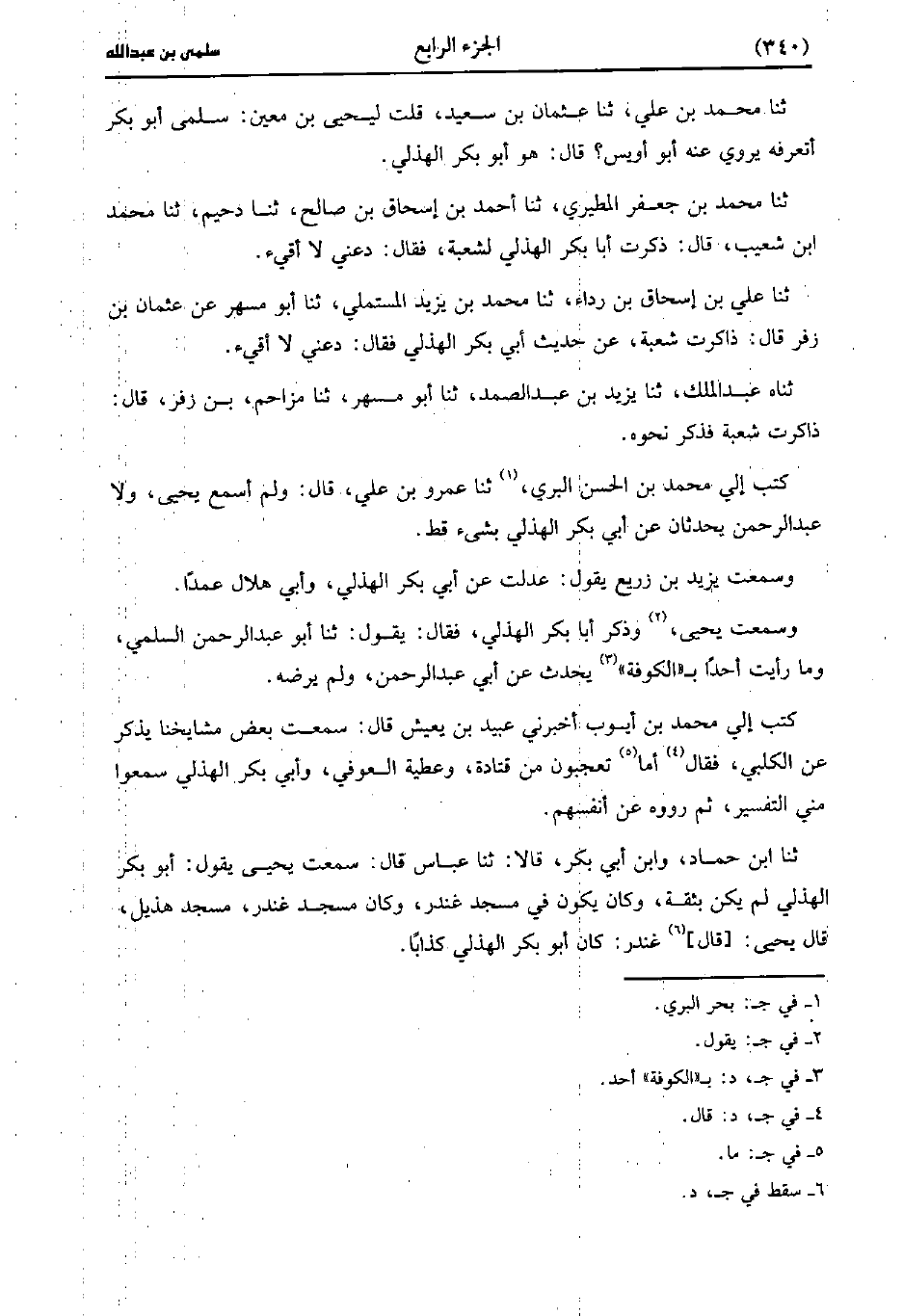 وسمعت يَحْيى وذكر أبا بكر الهذلي فقال يقول، حَدَّثَنا أبو عَبد الرَّحْمَن السلمي وما رأيت أحدا بالكوفة يحدث، عَن أبي عَبد الرَّحْمَن ولم يرضه.