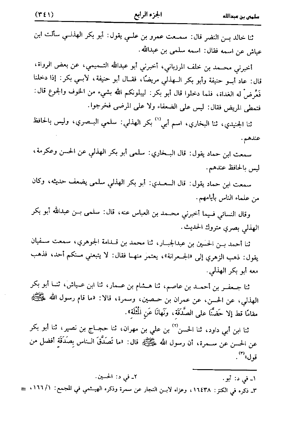 حَدَّثَنَا خالد بن النضر، قَالَ: سَمِعْتُ عَمْرو بْنَ عَلِيٍّ يَقُولُ أبو بكر الهذلي سألت بن عياش عن اسمه فقال اسمه سلمى بْن عَبد اللَّه.