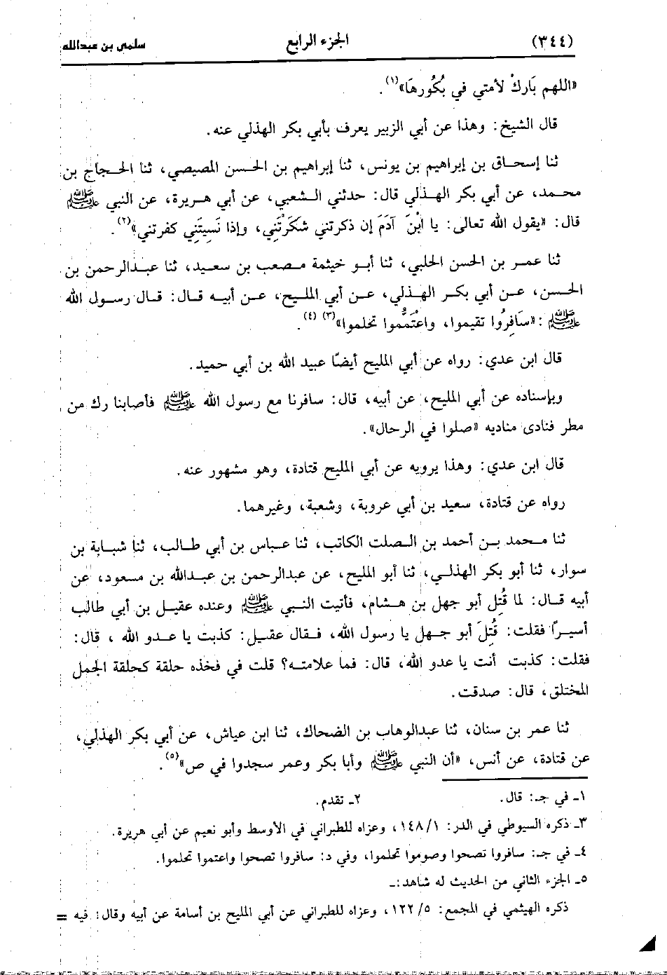 حَدَّثَنَا مُحَمد بْنُ أَحْمَدَ بْنِ الصلت الكاتب، حَدَّثَنا عَبَّاسُ بْنُ أَبِي طَالِبٍ، حَدَّثَنا شبابة بن سوار، حَدَّثَنا أبو بكر الهذلي، حَدَّثَنا أَبُو الْمَلِيحِ عَنْ عَبد الرَّحْمَنِ بْنِ عَبد اللَّهِ بْنِ مَسْعُودٍ، عَنْ أَبِيهِ قَال: لَمَّا قُتِلَ أَبُو جَهْلِ بْنِ هِشَامٍ فَأَتَيْتُ النَّبِيُّ صَلَّى اللَّهُ عَلَيهِ وَسلَّمَ وَعِنْدَهُ عَقِيلُ بْنُ أَبِي طَالِبٍ أَسِيرٌ فَقُلْتُ قُتِلَ أَبُو جَهْلٍ يَا رَسُولَ اللهِ فَقَالَ عُقَيْلُ كَذَبْتَ يَا عَدُوَ اللَّهِ قَالَ فقلت كذبت أنا يَا عَدُوَّ اللَّهِ قَالَ فَمَا عَلامَتُهُ قُلْتُ فِي فَخْذِهِ حَلَقَةٌ كَحَلَقَةِ الْجَمَلِ الْمُخْتَلِقِ قَالَ صَدَقْتَ.