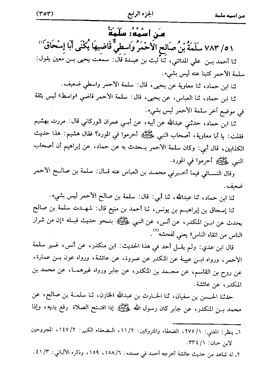 حَدَّثَنَا ابن حماد، حَدَّثَنا عَبد الله، حَدَّثَنا أبي قَالَ سلمة بْن صالح الأحمر ليس بشَيْءٍ.