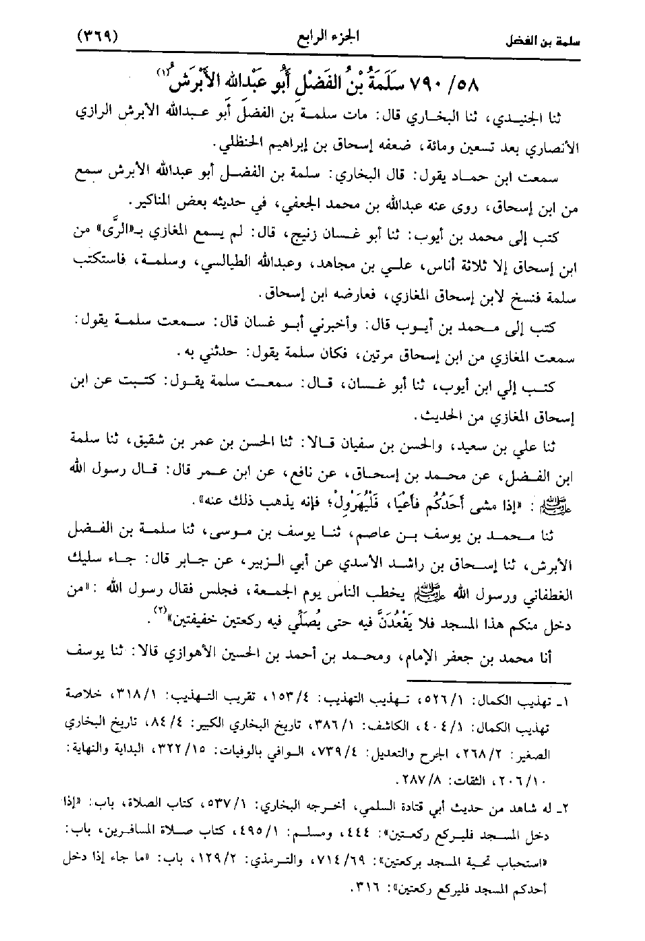 حَدَّثَنَا الجنيدي، حَدَّثَنا البُخارِيّ قال مات سلمة بْن الفضل أبو عَبد اللَّه الأبرش الرازي الأنصاري بعد تسعين ومِئَة ضعفه إسحاق بْن إِبْرَاهِيم الحنظلي.