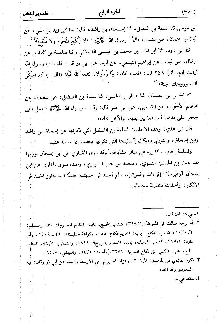 بْنُ مُوسَى، حَدَّثَنا سَلَمَةُ بْنُ الفضل، حَدَّثَنا إِسْحَاقُ بْنُ رَاشِدٍ، قَال: حَدَّثني زَيدُ بْنُ عَلِيٍّ عَنْ أَبَان بْنِ عُثْمَانَ عَنْ عُثْمَانَ قَال رَسُول اللهِ صَلَّى اللَّهُ عَلَيهِ وَسلَّمَ: لاَ يَنْكَحُ الْمُحْرِمُ، ولاَ ينكح.