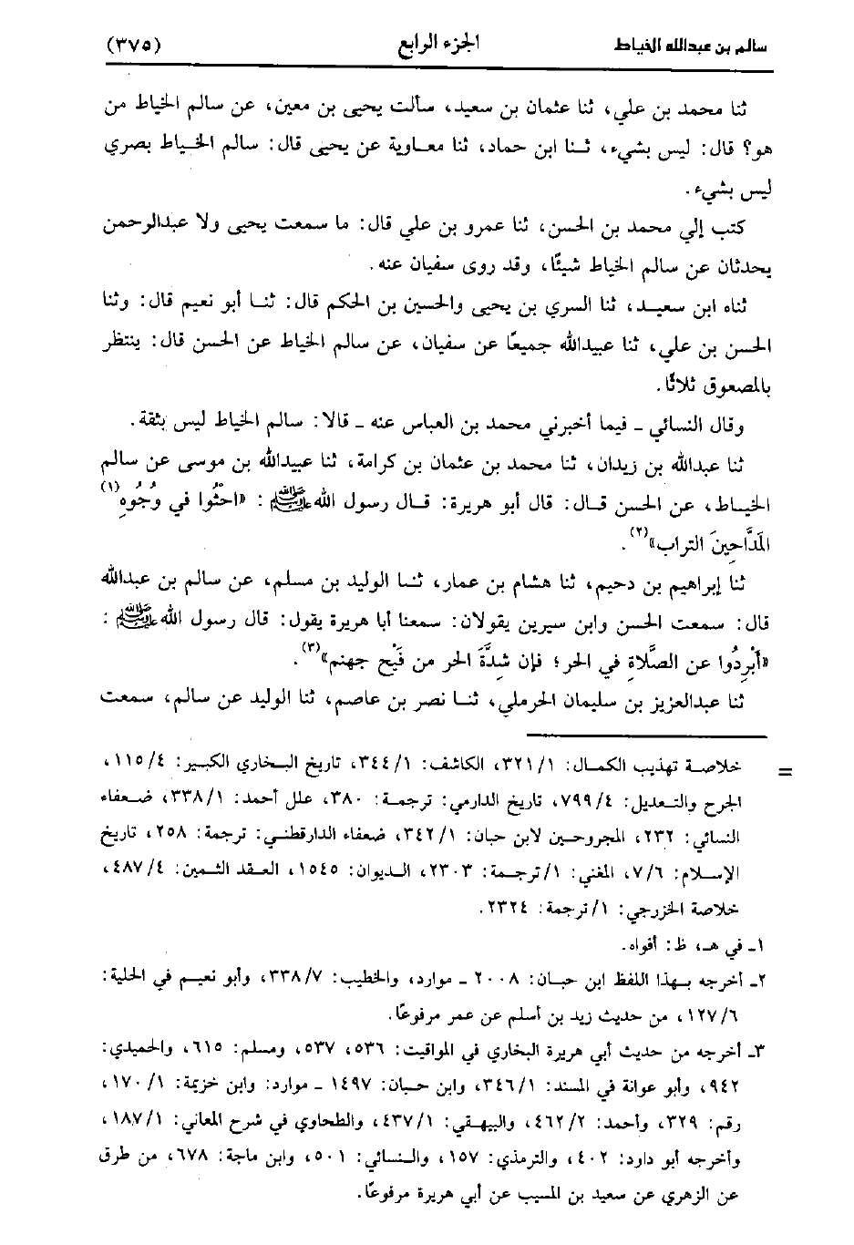 وقال النَّسائِيُّ، فيما أخبرني مُحَمد بن العباس، عنه: قال سالم الخياط ليس بثقة، حَدَّثَنا عَبد اللَّهِ بْنُ زَيْدَانَ، حَدَّثَنا مُحَمد بْنُ عُثْمَانَ بْنِ كَرَامَةَ، حَدَّثَنا عُبَيد اللَّهِ بْنُ مُوسَى عَنْ سَالِمٍ الْخَيَّاطُ عَنِ الْحَسَنِ، قَال: قَال أَبُو هُرَيْرَةَ قَال رَسُول اللهِ صَلَّى اللَّهُ عَلَيهِ وَسلَّمَ احْثُوا فِي أَفْوَاهِ المداحين التراب.
