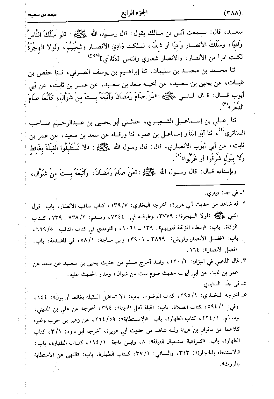 حَدَّثَنَا مُحَمد بْنُ مُحَمد بْنِ سليمان، حَدَّثَنا إبراهيم بن يوسف الصيرفي، حَدَّثَنا حَفْصُ بْنُ غَيَّاثٍ، عَن يَحْيى بْنِ سَعِيد عَنْ أَخِيهِ سَعْدِ بْنِ سَعِيد عَنْ عُمَر بْنِ ثَابِتٍ، عَن أَبِي أَيُّوبَ، قَال: قَال النَّبِيُّ صَلَّى اللَّهُ عَلَيهِ وَسلَّمَ مَنْ صَامَ رَمَضَانَ وَأتَبْعَهُ بِسِتٍ مِنْ شَوَّالٍ كَأَنَّمَا صَامَ الدهر.