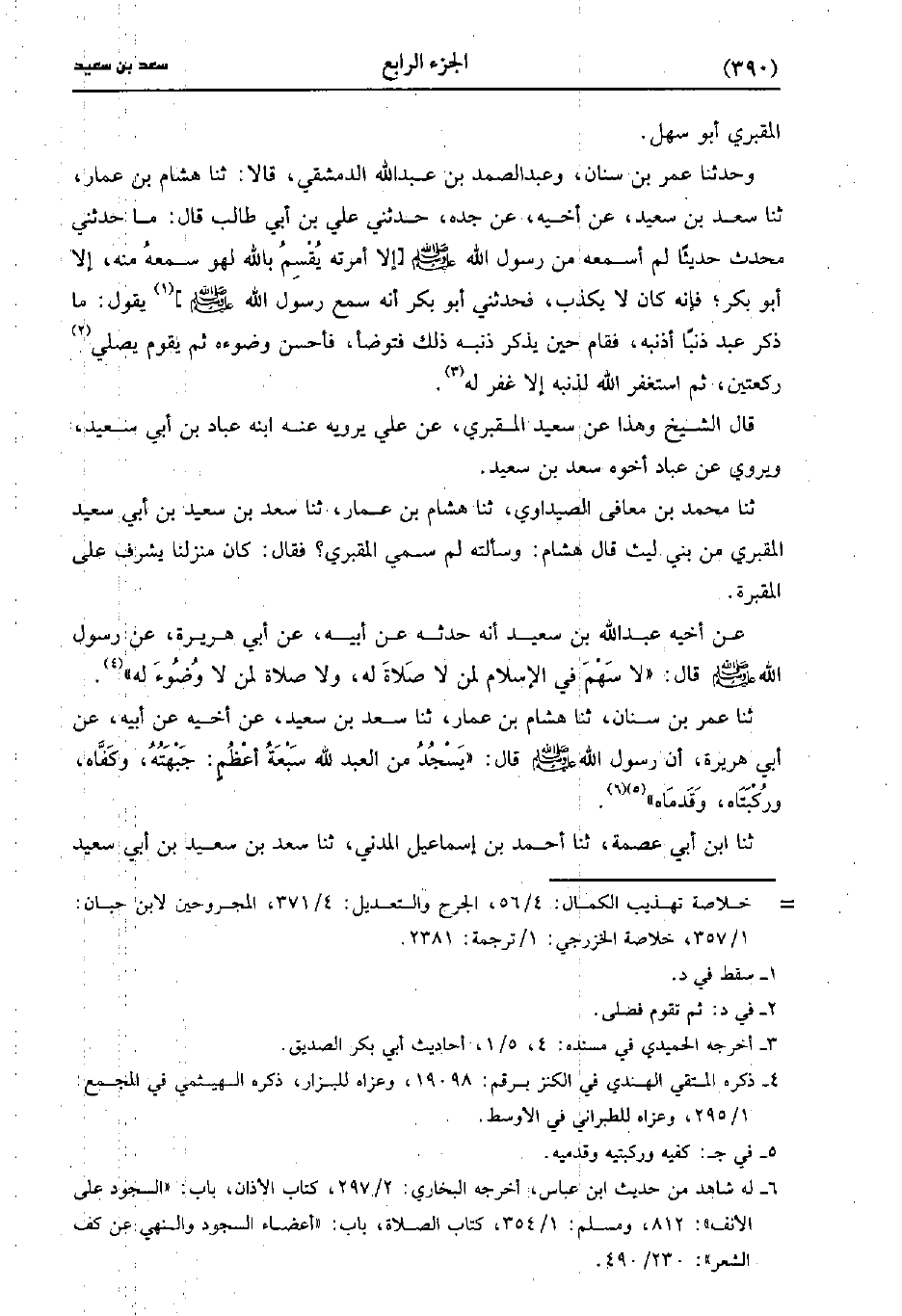 حَدَّثَنَا عُمَر بْنُ سِنَانٍ، حَدَّثَنا هِشَامُ بْنُ عَمَّارٍ، حَدَّثَنا سَعِيد بْنُ سَعِيد عَنْ أَخِيهِ، عَنْ أَبِيهِ، عَن أَبِي هُرَيْرَةَ أَنَّ رَسُولِ اللَّهِ صَلَّى اللَّهُ عَلَيْهِ وَسَلَّمَ صَلَّى اللَّهُ عَلَيه وسَلَّم قَال: يَسْجُدُ مِنَ الْعَبْدِ لِلَّهِ سَبْعَةَ أَعْظُمٍ جَبْهَتُهُ وَكَفَّاهُ وَرُكْبَتَاهُ وَقَدَمَاهُ.