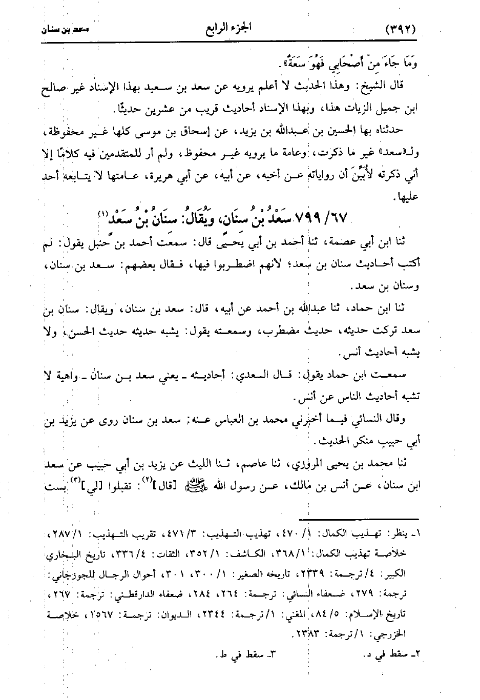 حَدَّثَنَا ابْنُ أَبِي عِصْمَةَ، حَدَّثَنا أَحْمَدُ بْنُ أَبِي يَحْيى، قَالَ: سَمِعْتُ أَحْمَدُ بْنُ حَنْبَلٍ يَقُولُ لم أكتب أحاديث سنان بْن سعد لأنهم اضطربوا بها فقال بعضهم سعد بْن سنان وسنان بن سعد.