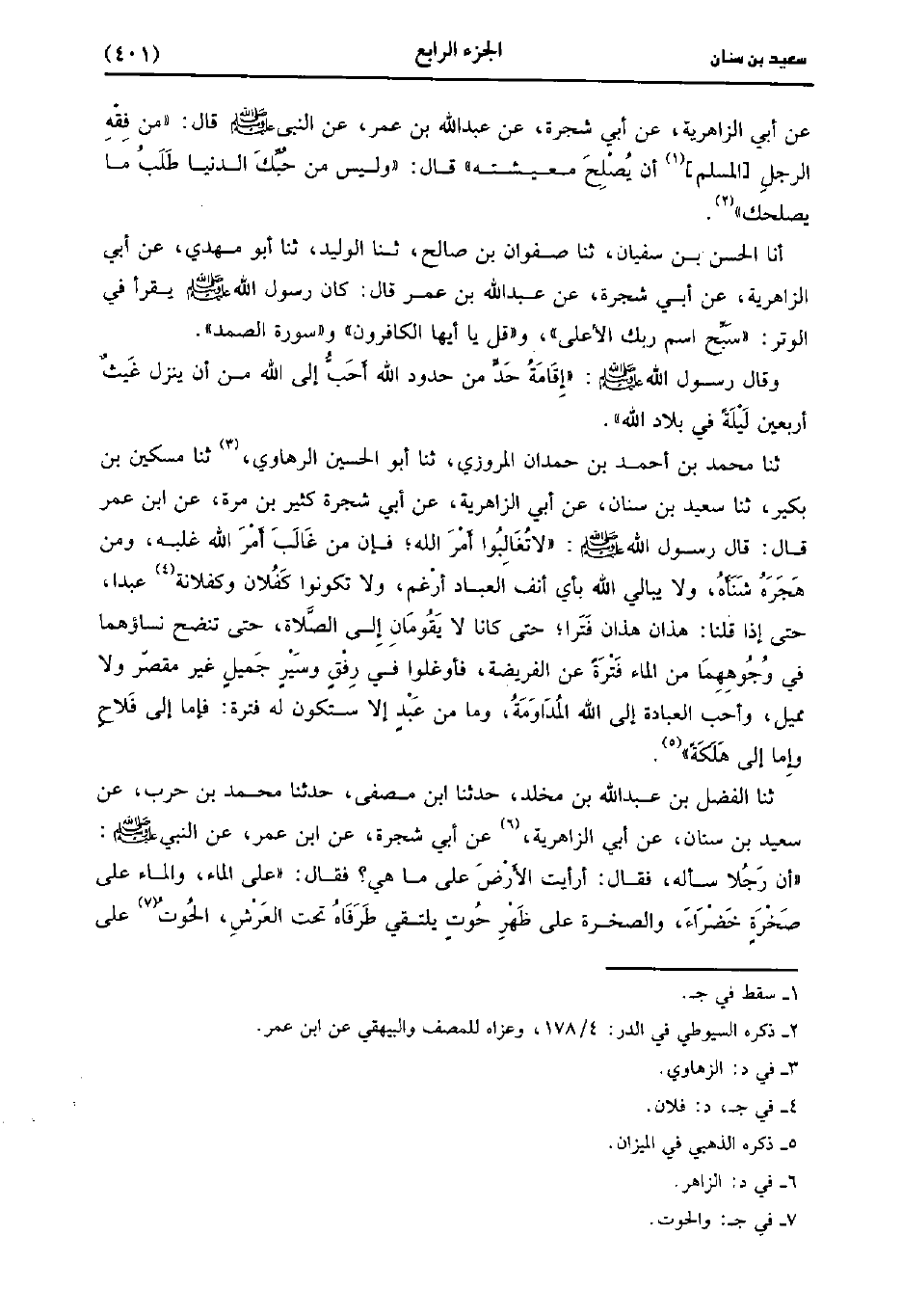 حَدَّثَنَا الفضل بن عَبد اللَّه بْنِ مَخْلَدٍ، حَدَّثَنا ابْنُ مُصْفَى، حَدَّثَنا مُحَمد بْنُ حَرْبٍ عَنْ سَعِيد بْنُ سِنَانٍ، عَن أَبِي الزَّاهِرِيَّةِ، عَن أَبِي شَجَرَةٍ، عنِ ابْنِ عُمَر عَنِ النَّبِيِّ صَلَّى اللَّهُ عَلَيهِ وَسلَّمَ أَنَّ رَجُلا سَأَلَهُ فَقَالَ أَرَأَيْتَ الأَرْضَ عَلَى مَا هِيَ فَقَالَ عَلَى الْمَاءِ وَالْمَاءُ عَلَى صَخْرَةٍ خَضْرَاءَ وَالصَّخْرَةُ عَلَى ظَهْرِ حُوتٍ يَلْتَقِي طَرَفَاهُ تحت العرش الحوت على