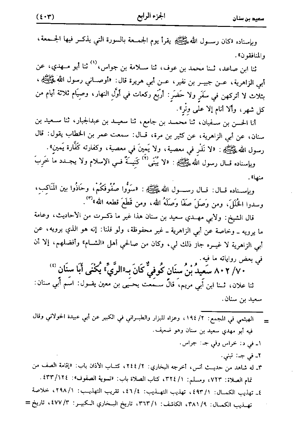 قال الشيخ: ولأبي مهدي سَعِيد بْن سنان هَذَا غَيْرَ مَا ذَكَرْتُ مِنَ الأحاديث وعامة ما يرويه وخاصة، عَن أبي الزاهرية غير محفوظة ولو قلنا إنه هو الذي يرويه، عَن أبي الزاهرية لا غيره جاز ذلك لي وكان من صالحي أهل الشام وأفضلهم إلاَّ أن في بعض رواياته ما فيه.