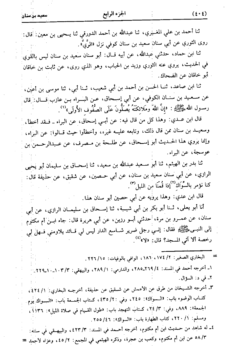 قَالَ ابنُ عَدِي وَهَذَا كُلُّ مَنْ قَالَ فِيهِ، عَن أبي إسحاق عن البراء فقد أخطأ وسعيد بْن سنان ممن قَالَ ذلك وتابعه عليه غيره وأخطأوا حيث قالوا عن البراء وإنما يروي هذا الحديث أبو إسحاق عَنْ طَلْحَةَ بْنِ مُصَرِّفٍ عَنْ عَبد الرَّحْمَنِ بْنِ عَوْسَجَةَ عَنِ البراء.