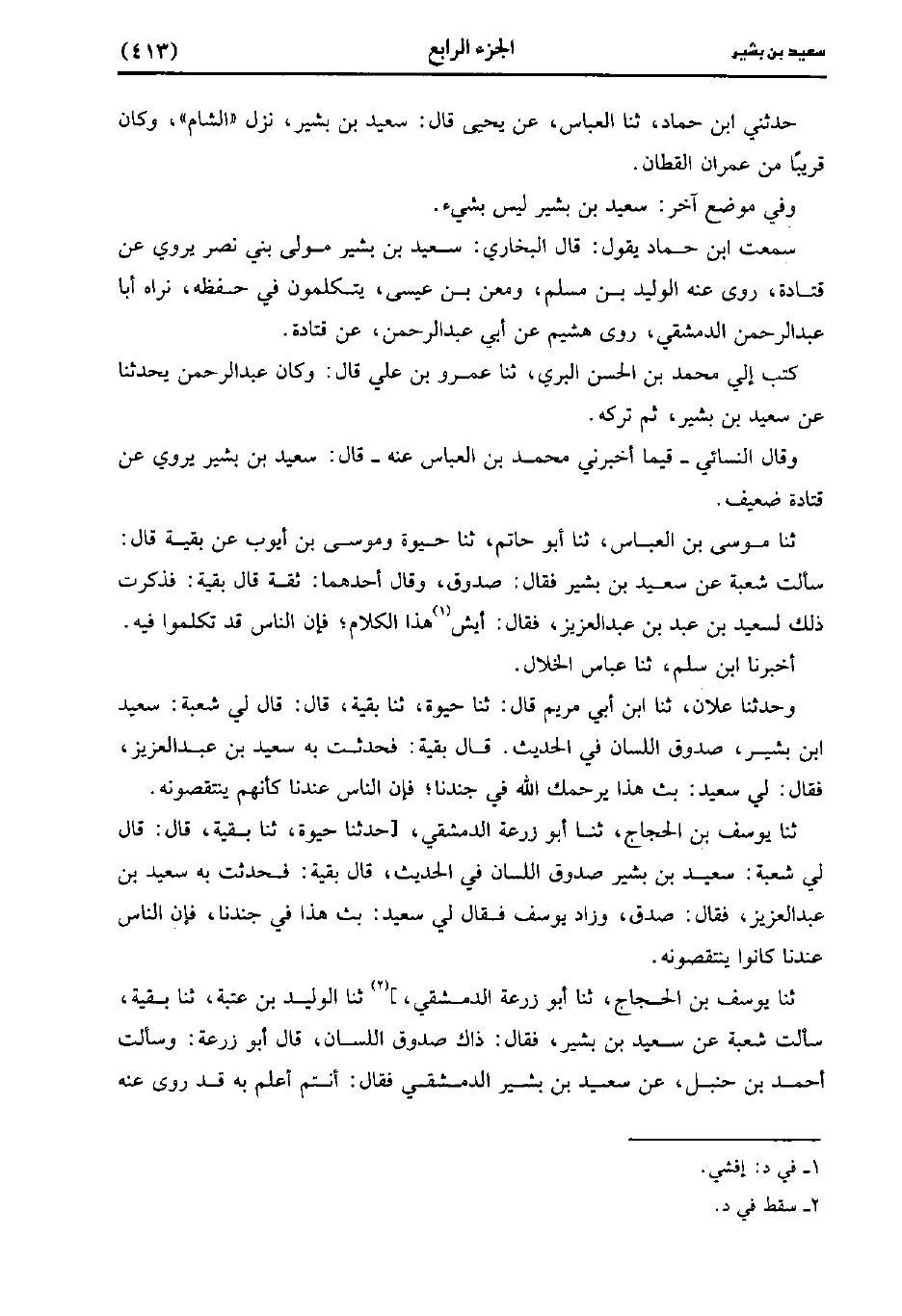 حَدَّثَنَا يوسف بن الحجاج، حَدَّثَنا أبُو زُرْعَةَ الدمشقي، حَدَّثَنا الوليد بن عتبة، حَدَّثَنا بقية سألت شُعْبَة عن سَعِيد بْن بشير فقال ذاك صدوق اللسان قَالَ أبُو زُرْعَةَ وسألت أَحْمَد بْن حنبل عن سَعِيد بْن بشير الدمشقي فقال أنتم اعلم به قد روى عنه