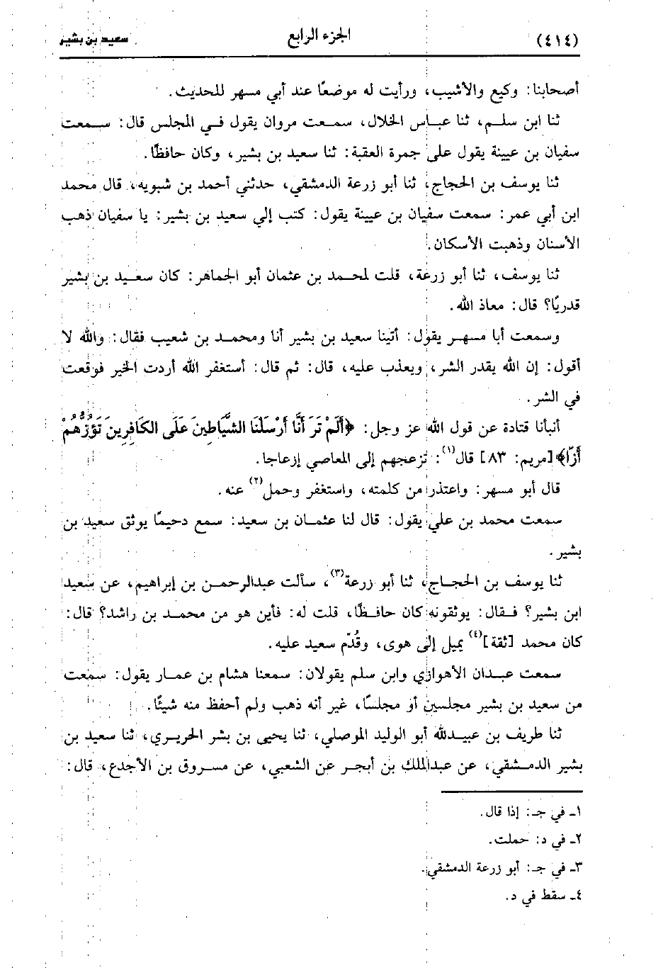 حَدَّثَنَا يوسف بن الحجاج، حَدَّثَنا أبُو زُرْعَةَ الدمشقي، حَدَّثني أحمد بْن شبويه قَالَ مُحَمد بْن أبي عُمَر سمعت سفيان بْن عُيَينة يقول كتب إلي سَعِيد بْن بشير يا سفيان ذهب الأسنان وذهبت الاسكان.