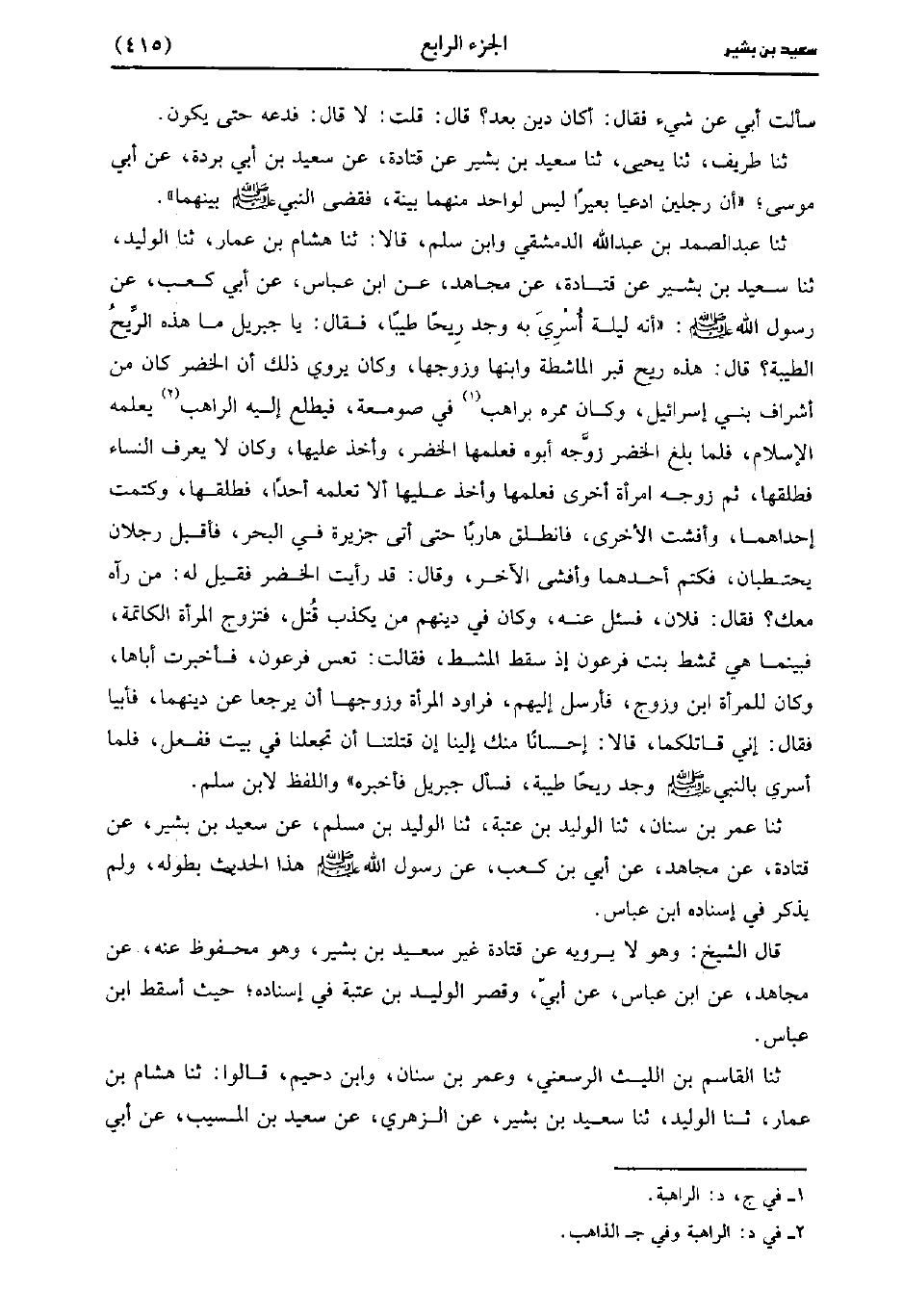 حَدَّثَنَا عَبد الصَّمَدِ بْنُ عَبد اللَّهِ الدِّمَشْقِيُّ، وَابْنُ سَلَمٍ، قَالا: حَدَّثَنا هِشَامُ بْنُ عَمَّارٍ، حَدَّثَنا الوليد، حَدَّثَنا سَعِيد بْنِ بَشِيرٍ، عَن قَتادَة عَنْ مُجَاهِدٍ، عنِ ابْنِ عَبَّاسٍ، عَن أُبَيِّ بْنِ كَعْبٍ عَنِ رَسُولِ اللَّهِ صَلَّى اللَّهُ عَلَيْهِ وَسَلَّمَ أَنَّهُ لَيْلَةَ أُسْرِيَ بِهِ وَجَدَ رِيحًا طَيِّبًا، فَقَالَ، يَا جِبْرِيلُ مَا هَذِهِ الرِّيحُ الطَّيِّبَةُ قَالَ هَذِهِ رِيحُ قَبْرِ الْمَاشِطَةِ وَابْنِهَا وَزَوْجِهِا وَكَانَ يَرْوِي ذَلِكَ أَنَّ الْخَضِرَ كَانَ مِنْ أَشْرَافِ بَنِي إِسْرَائِيَل وَكَانَ مَمَرُّهُ بِرَاهِبٍ فِي صَوْمَعَةٍ فَيَطَّلِعُ إِلَيْهِ الرَّاهِبُ يُعَلِّمْهُ الإِسْلامَ فَلَمَّا بَلَغَ الْخَضِرُ زَوَّجَهُ أَبُوهُ فَعَلَّمَهَا الْخَضِرُ وَأَخَذَ عَلَيْهَا وَكَانَ لا يَعْرِفُ النِّسَاءَ فَطَلَّقَهَا ثُمَّ زَوَّجَهُ امْرَأَةً أُخْرَى فَعَلَّمَهَا وَأَخَذَ عَلَيْهَا أَنْ لا تُعْلِمَهُ أَحَدًا فَطَلَّقَهَا وَكَتَمَتْ إِحْدَاهُمَا وأقشت الأُخْرَى فَانْطَلَقَ هَارِبًا حَتَّى أَتَى جَزِيرَةً فِي الْبَحْرِ فَأَقْبَلَ رَجُلانِ يَحْتَطِبَانِ فَكَتَمَ أَحَدُهُمَا وَأَفْشَى الآخَرَ وَقَالَ قَدْ رَأَيْتُ الْخَضِرَ فَقِيلَ لَهُ مَنْ رَآهُ مَعَكَ فَقَالَ فُلاٌن فَسُئِلَ عَنْهُ وَكَانَ فِي دِينِهِمْ مَنْ يَكْذِبُ قُتِلَ فَتَزَوَّجَ الْمَرْأَةَ الْكَاتِمَةَ فَبَيْنَمَا هِي تُمَشِّطُ بِنْتَ فِرْعَونَ إِذْ سَقَطَ الْمُشْطُ فَقَالَتْ تَعِسَ فِرْعَوْنُ فَأَخْبَرَتْ أَبَاهَا وكان للمرأة بن وَزَوْجٌ فَأَرْسَلَ إِلَيْهِمْ فَرَاوَدَ الْمَرْأَةَ وَزَوْجَهَا أَنْ يَرْجِعَا عَنْ دِينِهِمَا فَأَبَيَا فَقَالَ إِنِّي قَاتِلُكُمَا قَالا إِحْسَانًا مِنْكَ إِلَيْنَا إِنْ قَتَلْتَنَا أَنْ تَجْعَلَنَا فِي بَيْتٍ فَفَعَلَ فَلَمُّا أُسْرِيَ بِالنَّبِيِّ صَلَّى اللَّهُ عَلَيهِ وَسلَّمَ وَجَدَ رِيحًا طَيِّبَةً فَسَأَلَ جِبْرِيلَ فَأَخْبَرَهُ وَاللَّفْظِ لابْنِ سلم.