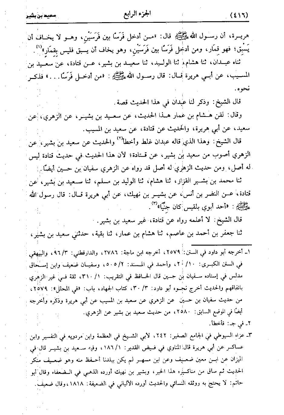 حَدَّثَنَاهُ عبدان، حَدَّثَنا هشام، حَدَّثَنا الوليد، حَدَّثَنا سَعِيد بْنِ بَشِيرٍ، عَن قَتادَة عَنْ سَعِيد بْنِ المُسَيَّب، عَن أَبِي هُرَيْرَةَ، قَال: قَال رَسُولُ اللَّهِ صَلَّى اللَّهُ عَلَيْهِ وَسَلَّمَ صَلَّى اللَّهُ عَلَيه وسَلَّم قَال: مَنْ أَدْخَلَ فَرَسًا فَذَكَرَ نَحْوَهُ.