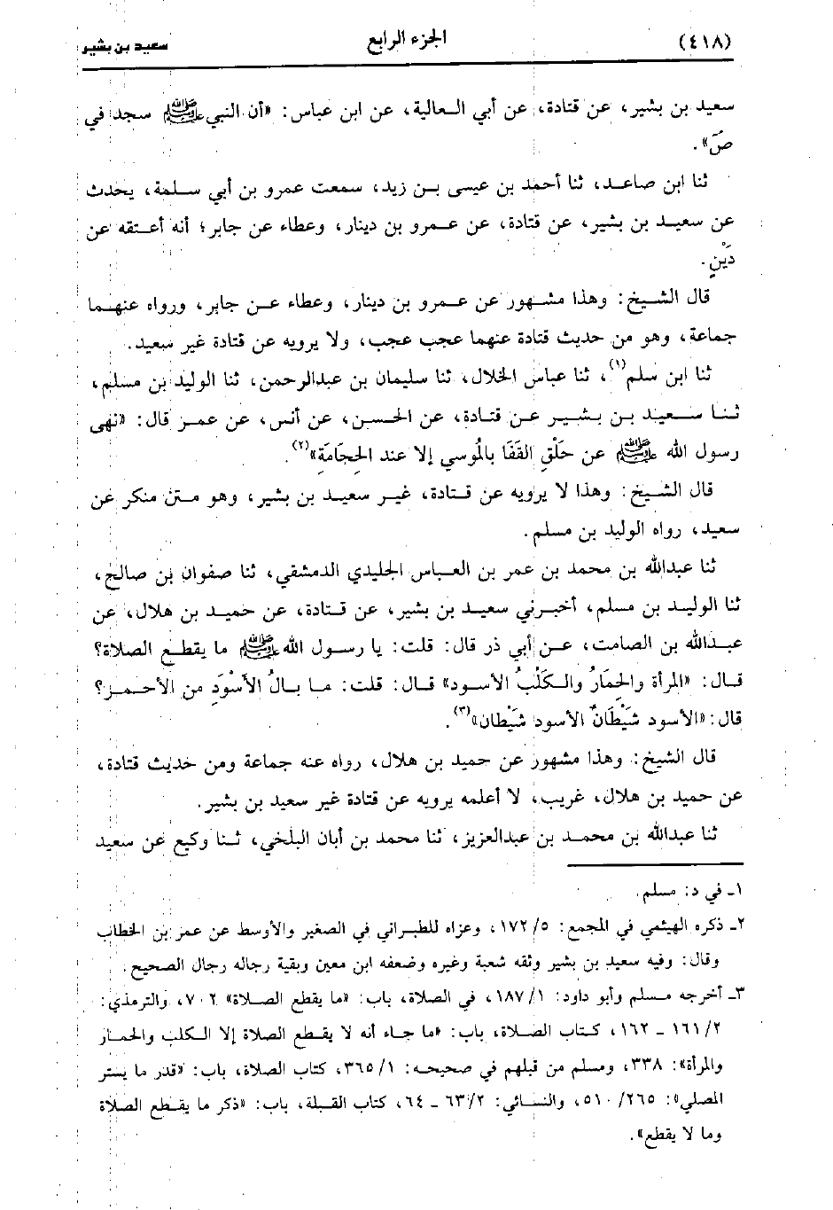 حَدَّثَنَا عَبد اللَّه بْنُ مُحَمد بْنِ عُمَر بْنِ الْعَبَّاسِ الْجَلِيدِيُّ الدمشقي، حَدَّثَنا صفوان بن صالح، حَدَّثَنا الْوَلِيدُ بْنُ مُسْلِمٍ أَخْبَرَنِي سَعِيد بْنِ بَشِيرٍ، عَن قَتادَة عَنْ حُمَيْدِ بْنِ هِلالٍ عَنْ عَبد اللَّهِ بْنِ الصَّامِتِ، عَن أَبِي ذَرٍّ، قالَ: قُلتُ يَا رَسُولَ اللهِ مَا يَقْطَعُ الصَّلاةَ قَالَ المرأة والحمار والكلب الأسود، قالَ: قُلتُ مَا بَالُ الأَسْوَدِ مِنَ الأَحْمَرِ قَالَ الأَسْوَدُ شَيْطَانٌ الأَسْوَدُ شَيْطَانٌ.
